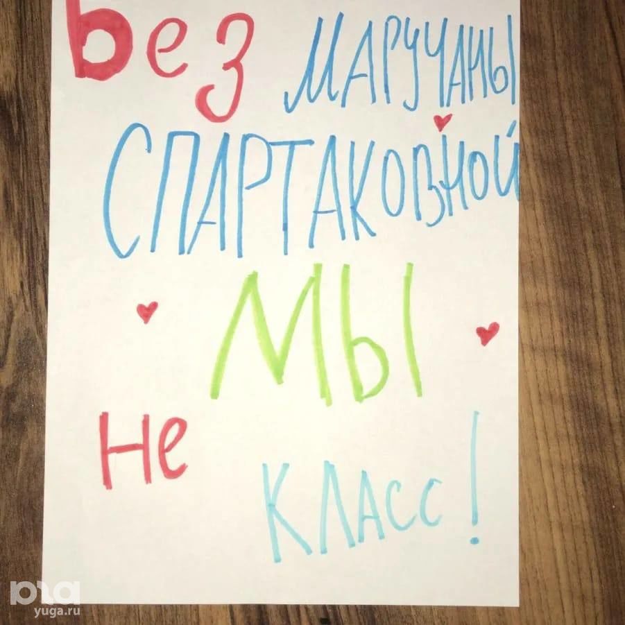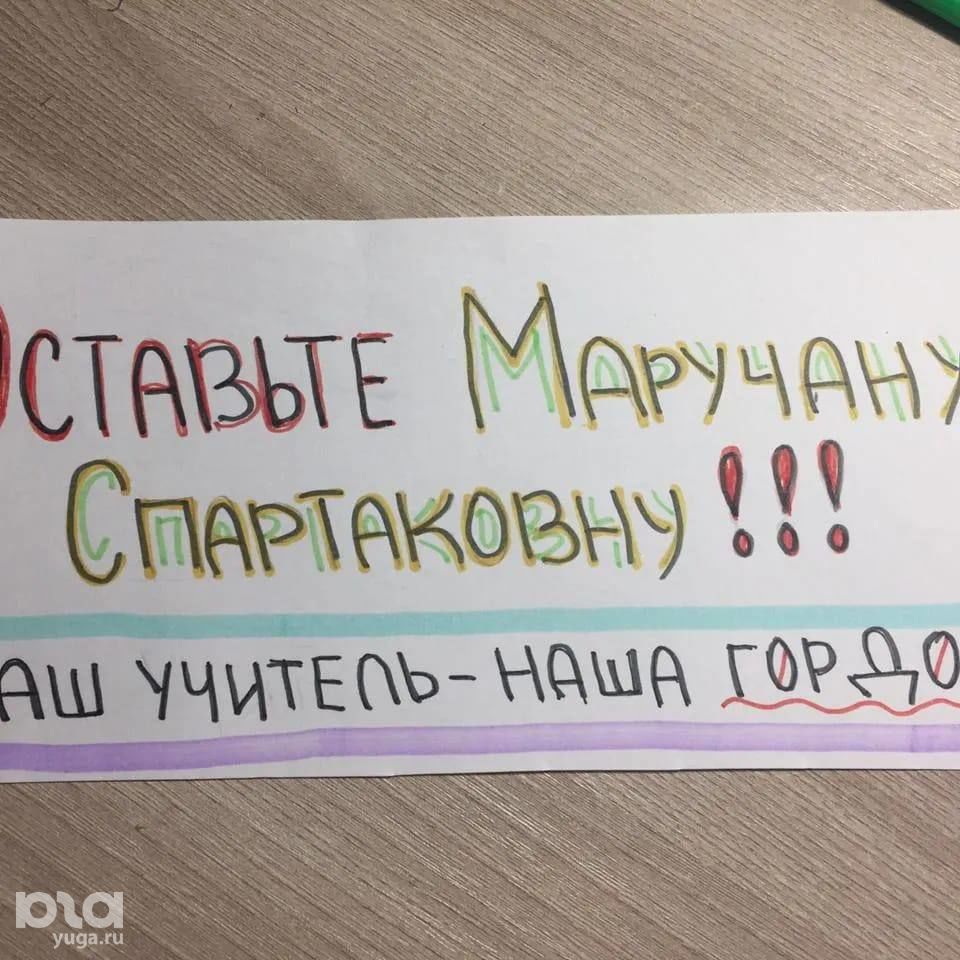 На плакатах, развешанных в коридорах и классах краснодарской гимназии № 92, разноцветными фломастерами нарисованы сердечки, солнце, цветы. «Оставьте Маручану Спартаковну», «Без Маручаны Спартаковны мы не класс», «Маручана Спартаковна. Наш учитель. Наша гордость!» — гласят надписи.