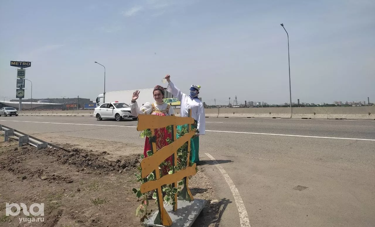 На подъезде вижу знаменитых героев «Деревни дураков» из развлекательной телевизионной передачи «Каламбур». Переодетые артисты зазывают машины — мужчина весело трясет над головой бутылку с мутной жидкостью. В 10 метрах от них стоят лучезарные девушки в кокошниках. Только их зачем-то поместили в столы на колесах (что? да!). Что хотел сказать автор этой конструкции, осталось загадкой.