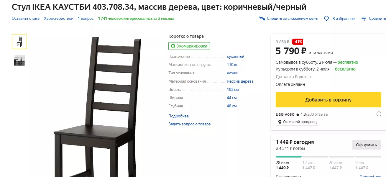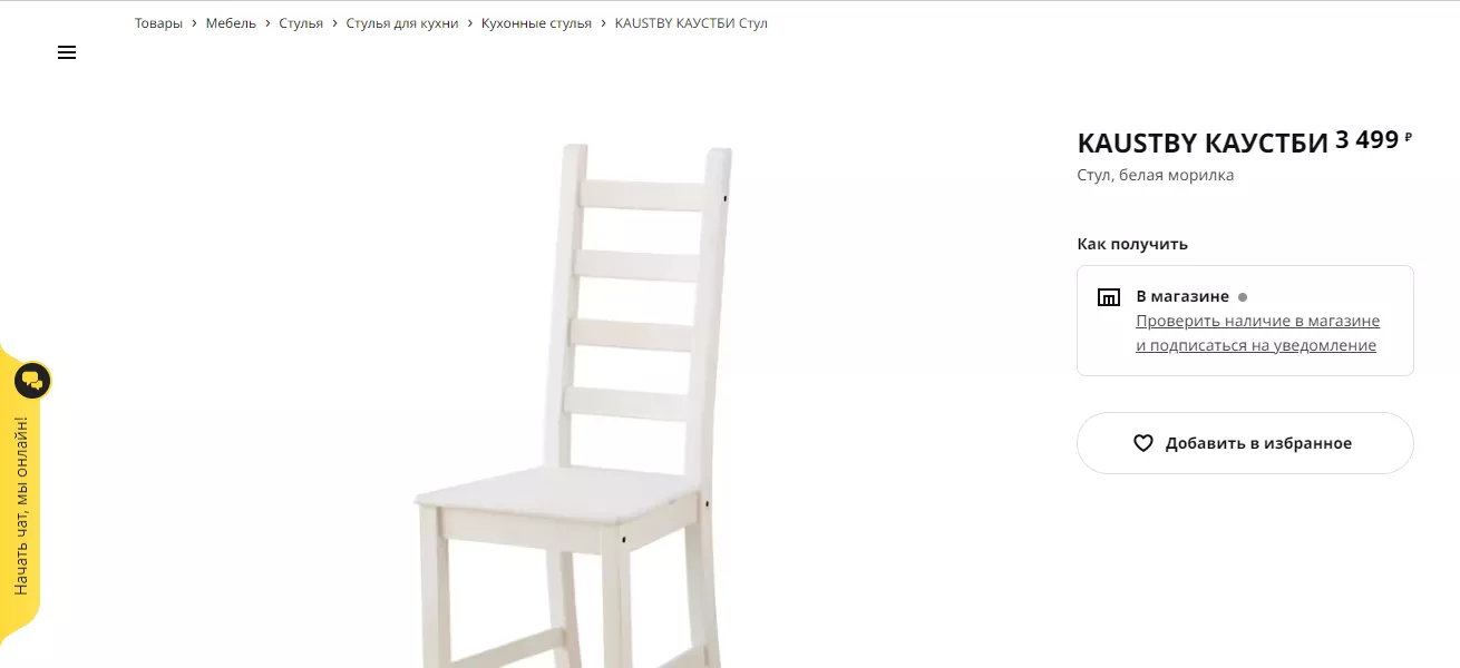 Популярный стул КАУСТБИ стоил 2 тыс. 349 рублей. Если сегодня ввести поисковой запрос и попробовать найти на различных ресурсах, то ситуация следующая. На сайте ИКЕА — 3 тыс. 499 рублей, на «Доставкин» 2 тыс. 299 рублей, на «Яндекс.Маркет» 5 тыс. 790 рублей, на del-i-very 2 тыс. 799 рублей, на «Отдел доставки» 2 тыс. 999 рублей.