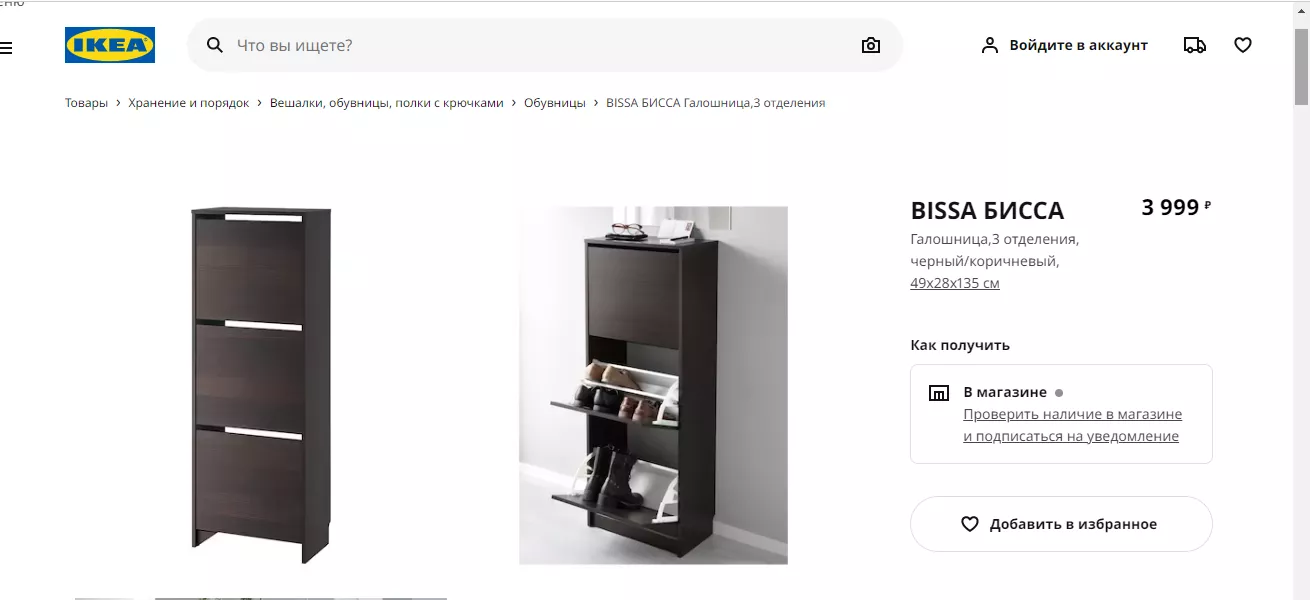 Трехсекционная обувница БИССА могла украсить коридор всего за 2 тыс. 999 рублей. На сайте ИКЕА она сейчас ровно на 1 тысячу дороже — 3 тыс. 999 рублей. Такой же ценник и на «Доставкин».
