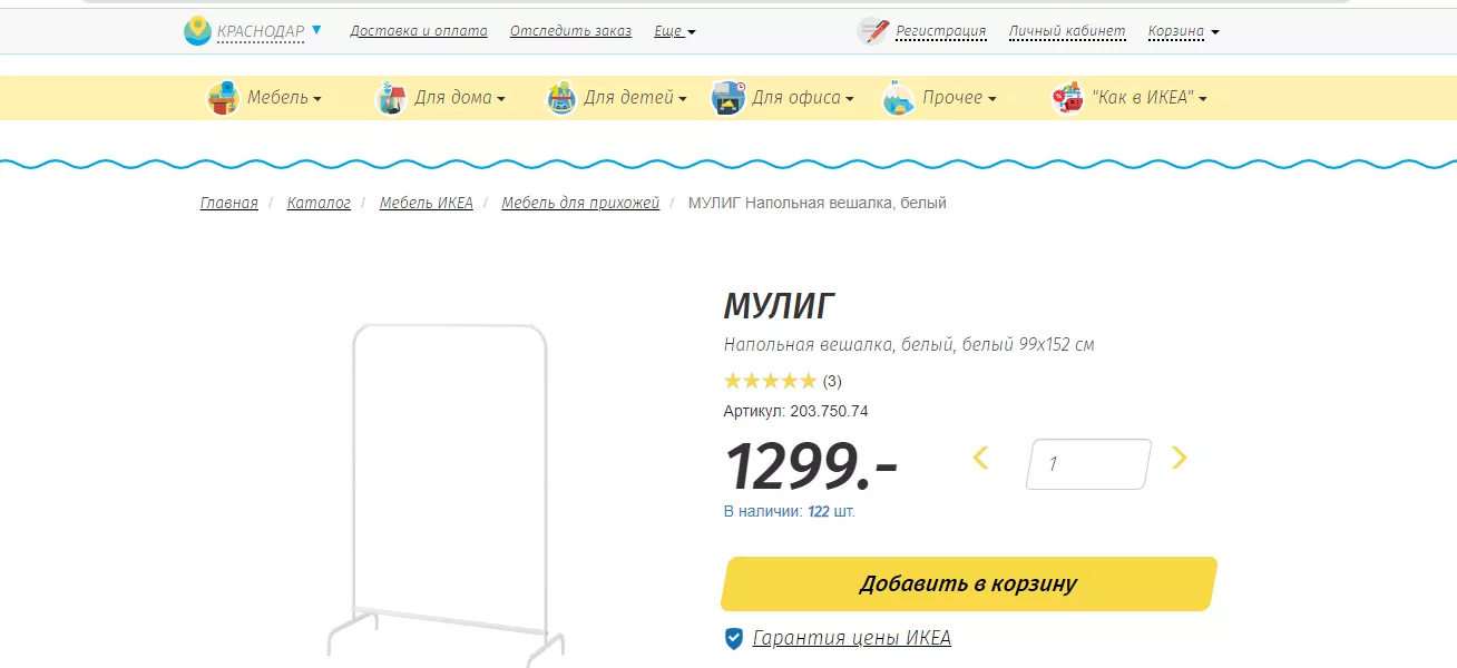 Напольная вешалка МУЛИГ магическим образом стала дешевле. В 2018 году, например, ее продавали за 1 тыс. 598 рублей в магазинах ИКЕА, сегодня на сайте «Доставкин» можно заказать за 1 тыс. 299 рублей, а на del-i-very — вообще за 799 рублей.