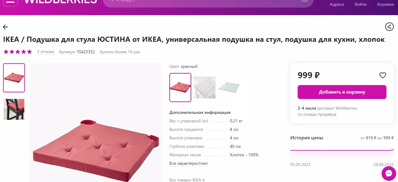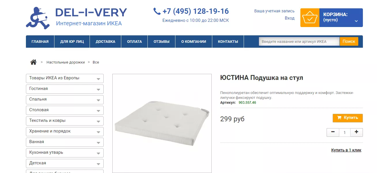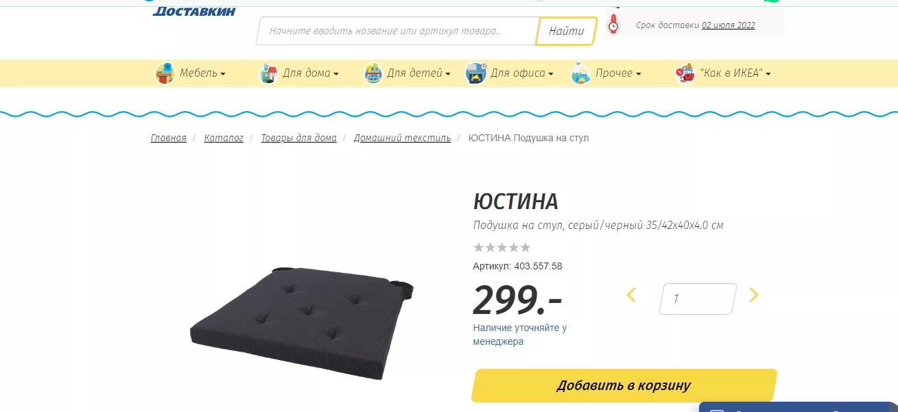 Подушка на стул ЮСТИНА стоила 299 рублей за штуку. Сегодня на сайте ИКЕА ее стоимость 349 рублей, а вот на «Доставкин» и del-i-very цена осталась прежней — 299 рублей.