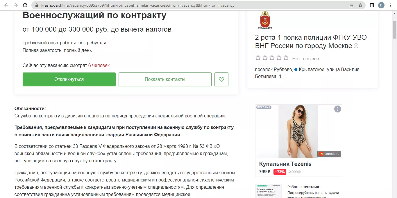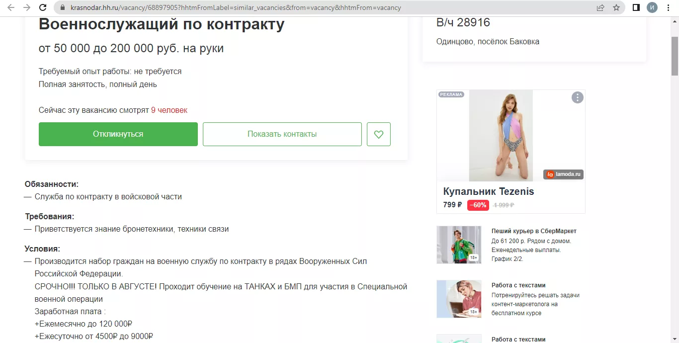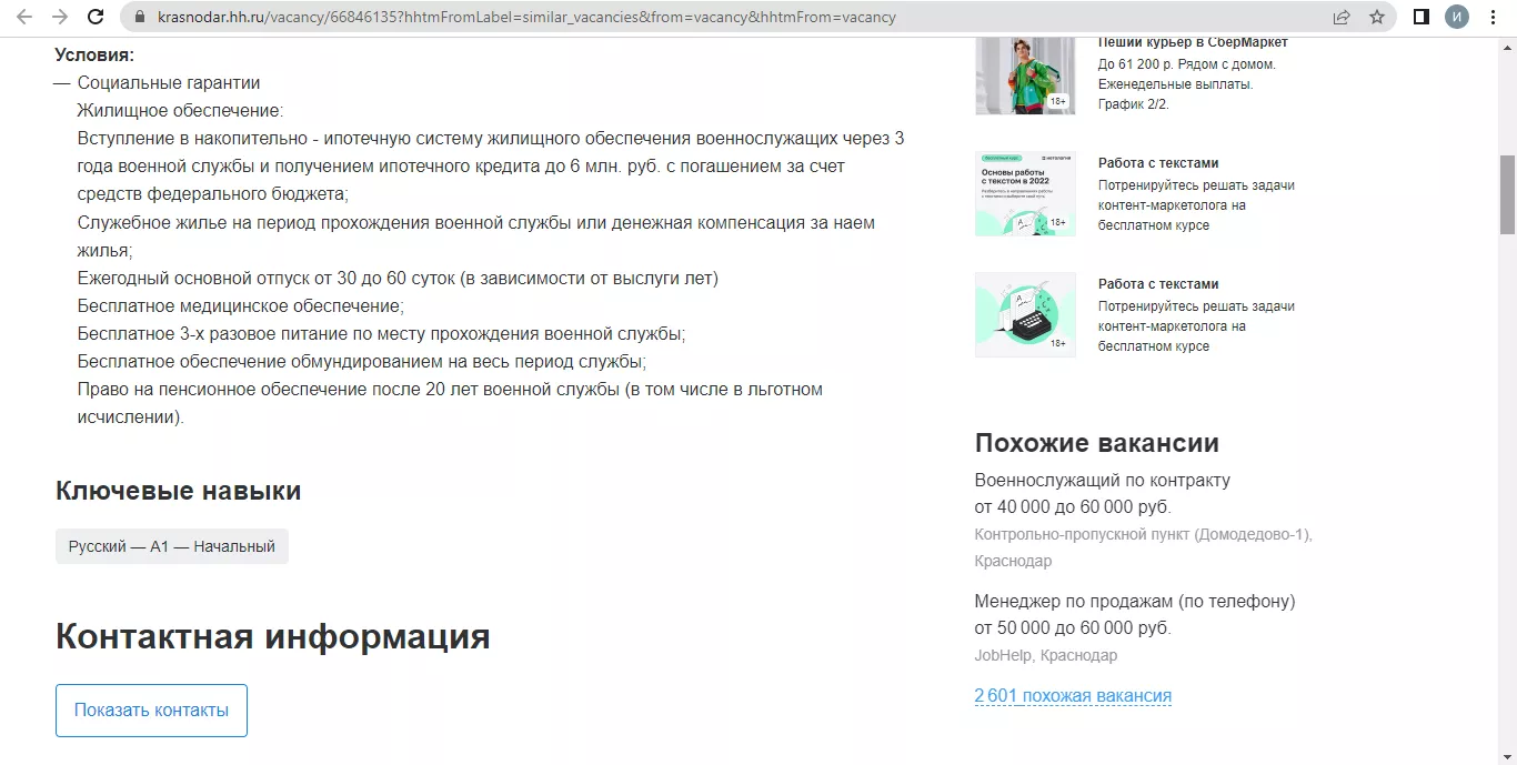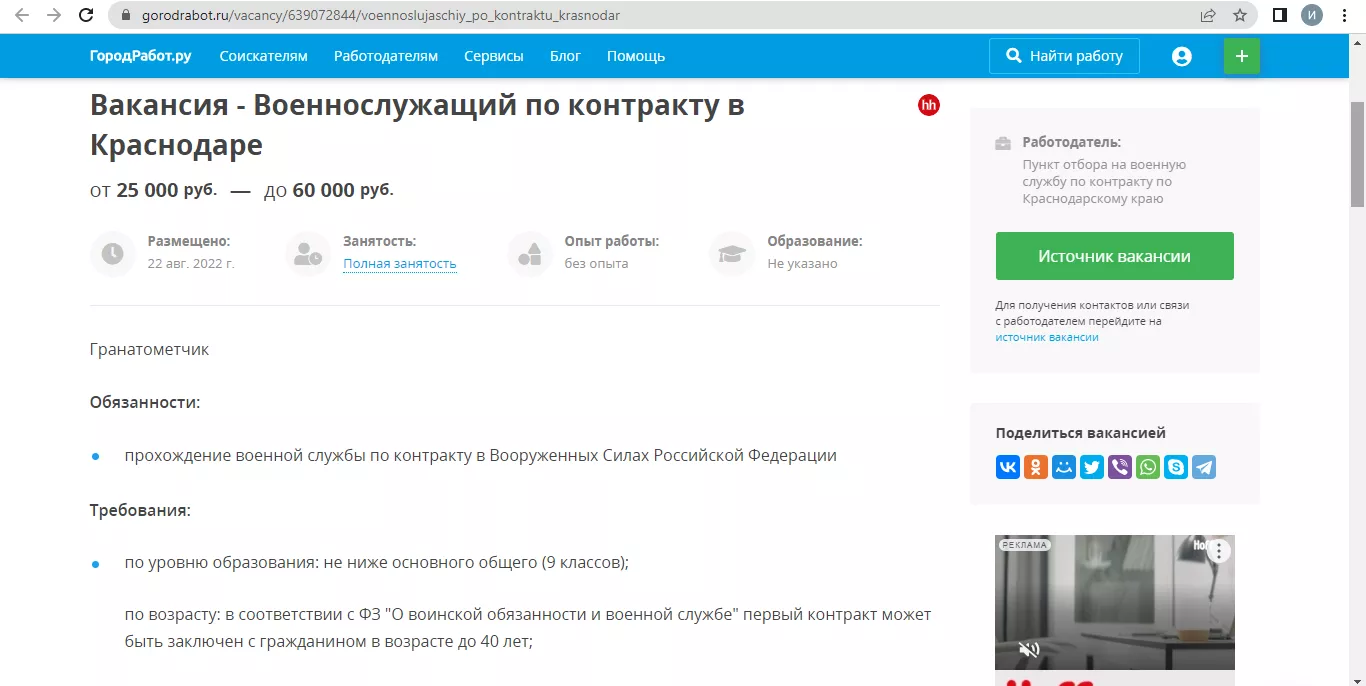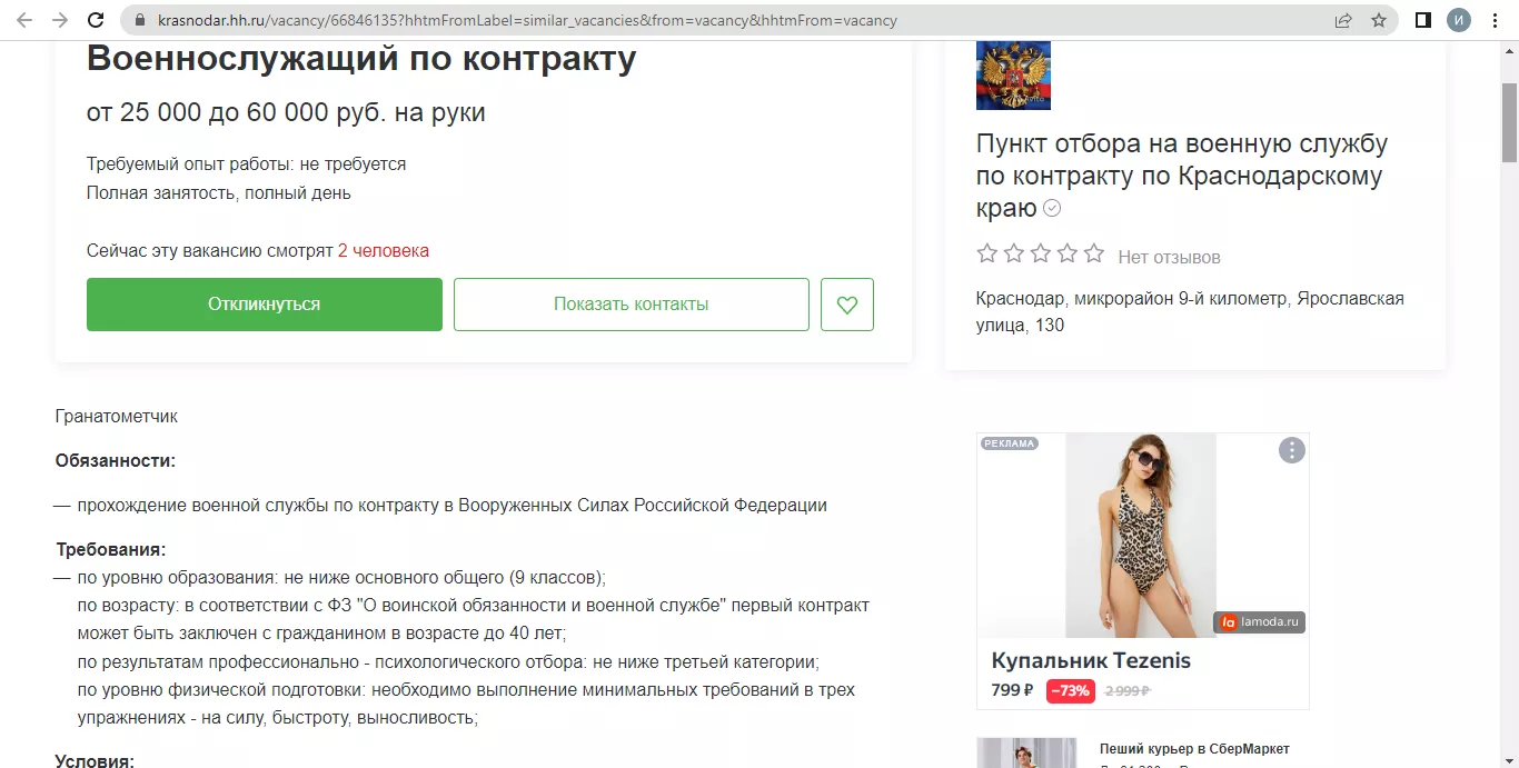 На остановках и билбордах в Краснодаре появилась реклама службы по контракту. Ссылка на плакатах ведёт на сайт Министерства обороны Российской Федерации. «Поступая на военную службу по контракту, вы выбираете стабильность, широкие возможности для самореализации, достойный уровень жизни и высокий социальный статус», — гласит текст на странице.
