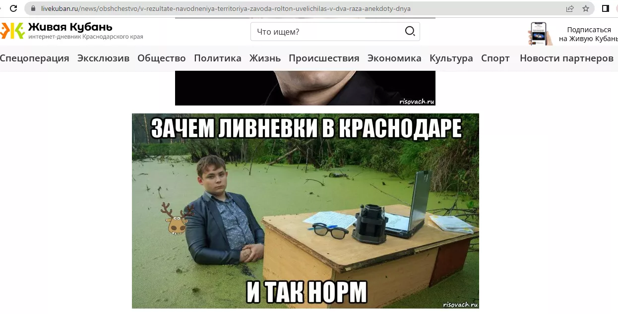 Хоть жители края и мечтают каждым летом о спасительных ливнях, все знают, что дожди нередко приводят к подтоплениям из-за плохо работающих ливнёвок. Людям ничего больше не остаётся, кроме как шутить над инфраструктурой.