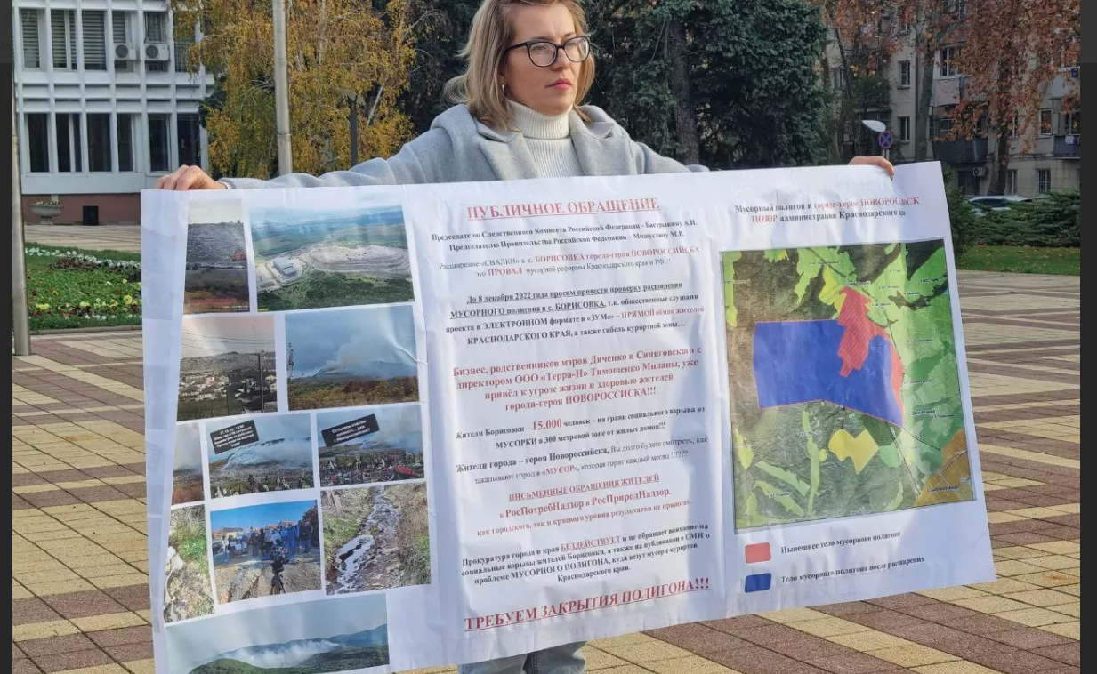 24 ноября Наталья, жительница Борисовки, вышла на одиночный пикет к администрации города, протестуя против расширения мусорного полигона на горе Щелба. На встречу с женщиной вышел председатель городской думы Новороссийска Александр Шаталов и ясно дал понять, что закрыть свалку сейчас нельзя, поскольку нового места под неё нет.