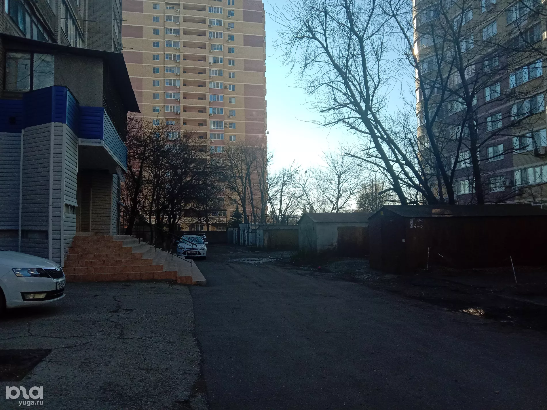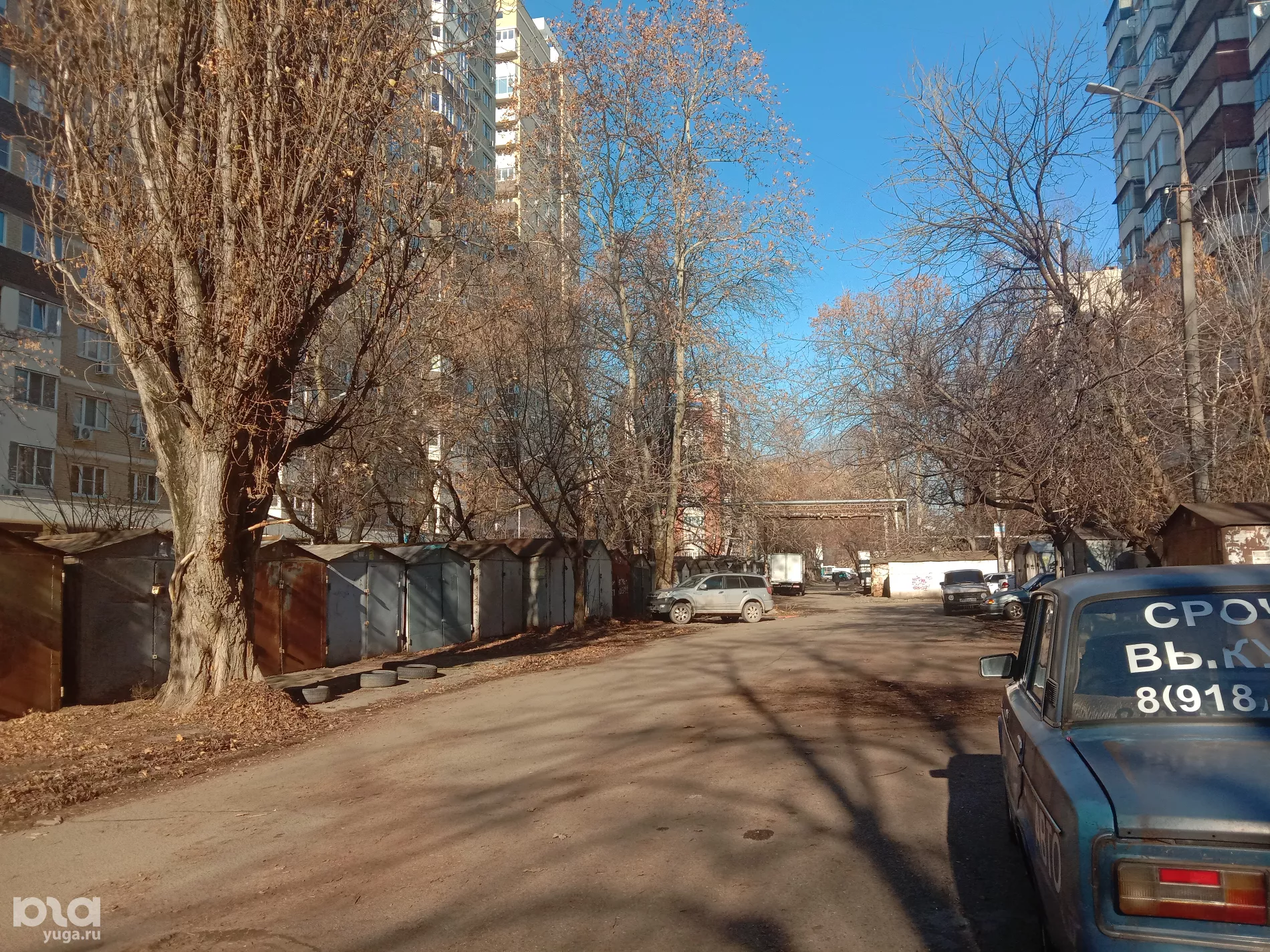 Путь к остановке — сомнительное удовольствие для пешехода: на Российской шум и выхлопные газы застрявших между светофорами машин, никаких деревьев, невысыхающие лужи. И шиномонтажки, которые не стесняются занимать узкие тротуары оборудованием. Во дворы не спрятаться — их заполнили ряды гаражей, многоэтажные дома огорожены заборами. Современные парковки, как заметно по видео с высоты, есть далеко не во всех новостройках. Но, оказывается, это к лучшему.