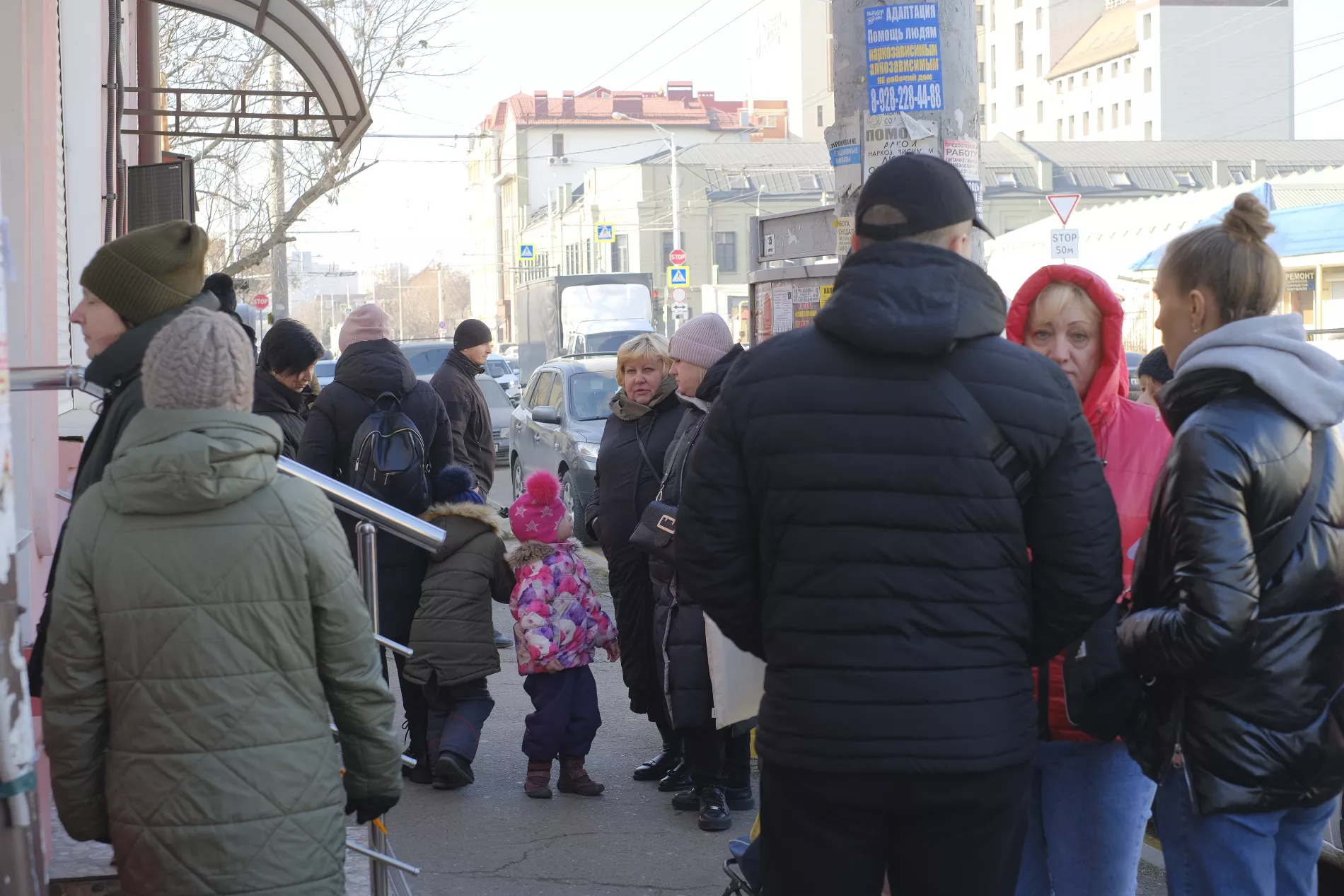За наборами пришли человек десять — все женщины и один мужчина. Они стояли в очереди у неприметной двери здания в районе Сенного рынка: рядом по улице Будённого проезжают машины. На выдачу гумпомощи пригласили и телевидение. В результате журналистов и персонала фонда оказалось больше, чем его подопечных.