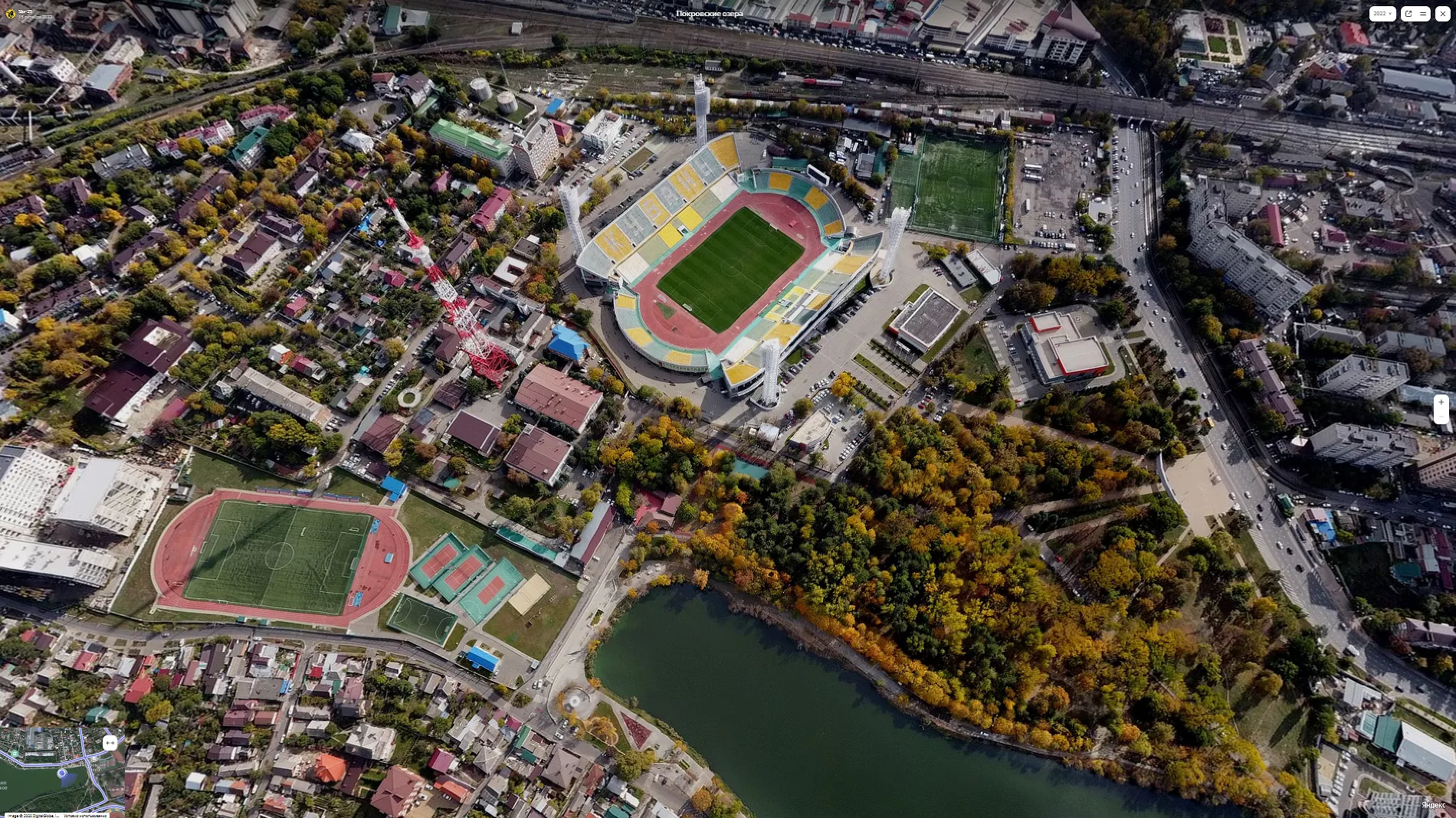 Вид от Нижнего Покровского озера на стадион «Кубань», Дмитриевскую дамбу и район вокзала «Краснодар-1» © Скриншот панорамы yandex.ru/maps 2020 года -