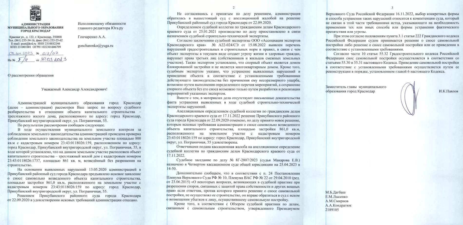 Редакция Юга.ру спросила мэрию о судах вокруг дома на Пограничной. Замглавы Краснодара Илья Павлов подчеркнул, что сохранить спорный объект возможно только при устранении нарушений, но их письменных доказательств нет в материалах дела.