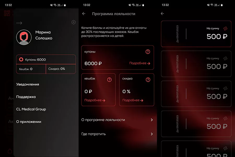 В приложении есть личный кабинет с купонами-бонусами, скидками и кешбэком. Нам начислено 6 тыс. рублей — это 12 купонов по 500 бонусов. Один бонус — один рубль. Ими можно оплатить до 100% стоимости услуг компаний-партнеров CL Medical Group.