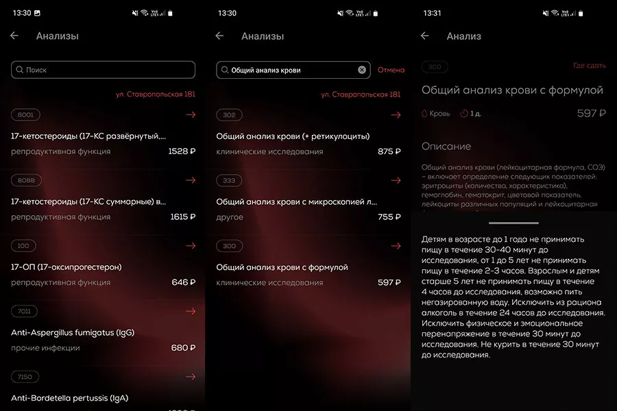 В поисковой строке в разделе «Анализы» набираем «общий анализ крови». Приложение предлагает три варианта и здесь же показывает стоимость. Выбираем «ОАК с формулой» за 597 рублей, и приложение показывает входящие в анализ показатели и — очень кстати — правила подготовки к процедуре для детей и взрослых.