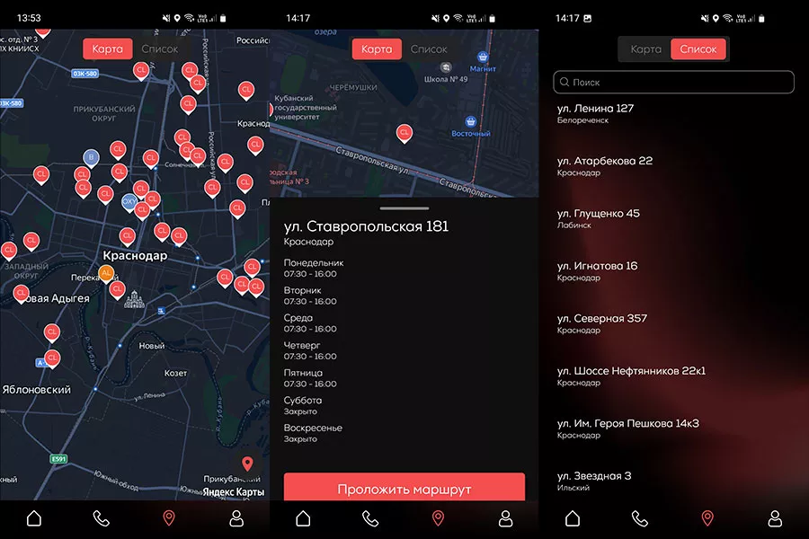 Удобная функция приложения: возможность видеть графики работы клиники и строить быстрый маршрут до пункта назначения в Google-картах. Если проще искать лабораторию по названию улицы, можно быстро выбрать нужную в «Списке».