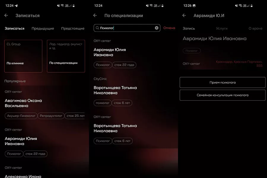 Записаться к необходимым врачам можно также быстро, нажав на иконку «Врачи» на главном экране. Нужного доктора находим по ФИО, названию клиники или специализации. Если хотим записаться, например, к психологу, но не знаем фамилию конкретного врача, достаточно набрать «психолог» в поисковой строке, а система предложит варианты. Останется выбрать только удобное время приема.