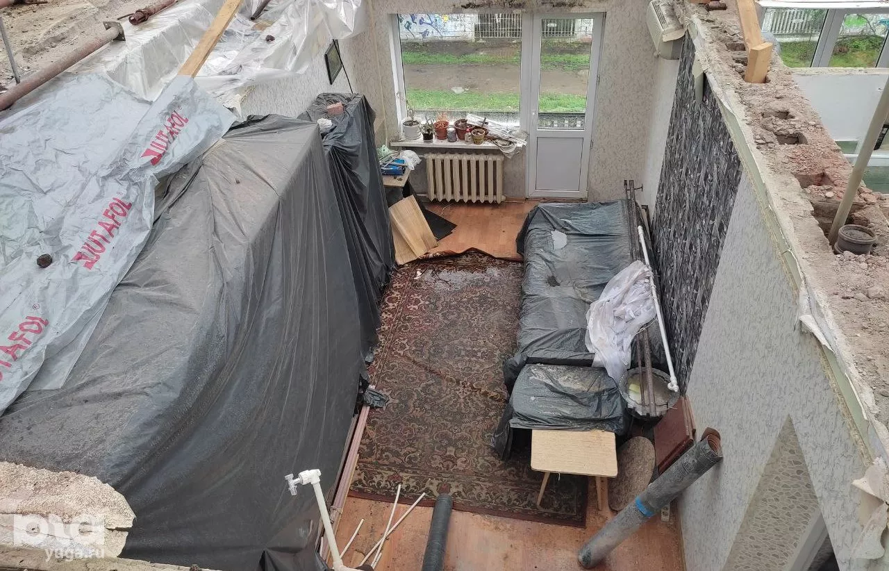 В большинстве комнат квартиры на пятом этаже нет пола, и через отсутствующие перекрытия видно комнаты на четвертом этаже — каркасы перегородок и внешние стены. Жильцы той квартиры предусмотрительно накрыли мебель черной пленкой. Только едва ли это спасет имущество от влажности и плесени. В прогнозах погоды — дожди.