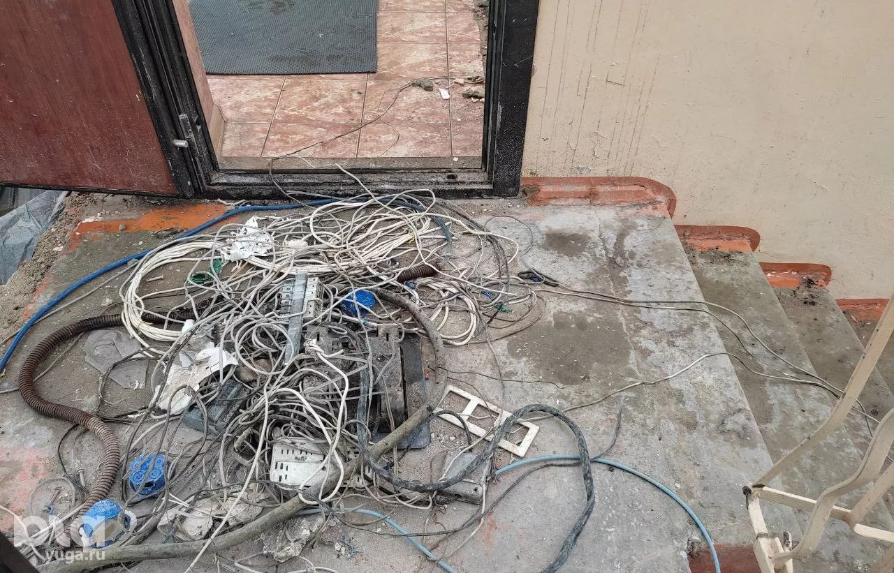 Мы заходим в подъезд, и нас встречают лужа и льющаяся сверху вода. Неудивительно, на выходных были ливни, дождь идет и сейчас. На мой вопрос, живут ли здесь люди, женщина пожимает плечами и начинает стучать в двери. Ответа не последовало. Она показывает на многочисленные провода и говорит, что дальше не пойдет — вдруг ударит током. Поскольку кота Антонина не нашла, она решила спускаться. Я, наоборот, поднимаюсь к месту ЧП.