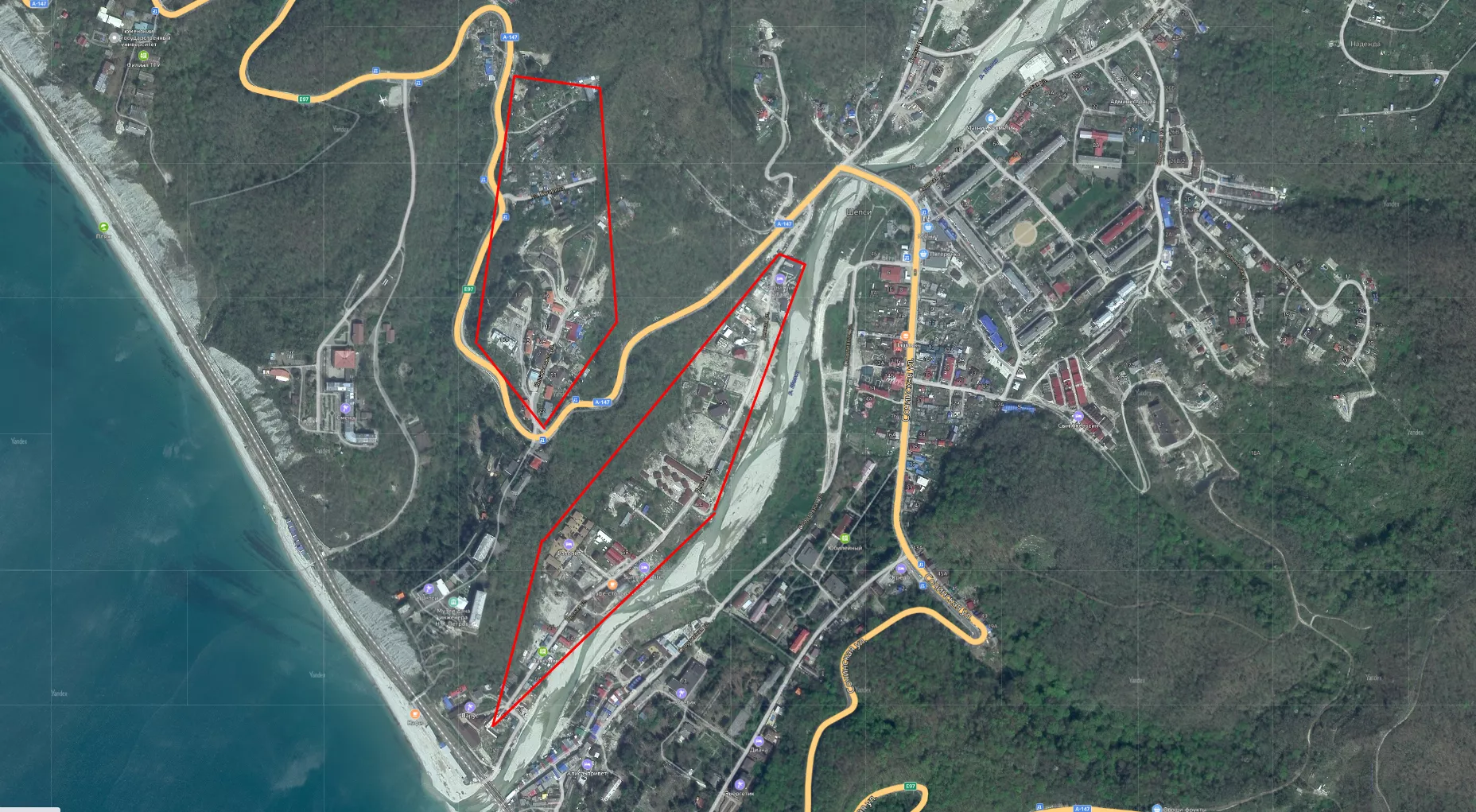 Спорные земли лежат в центре села Шепси, на правом берегу реки Шепси. К северу от трассы А-147 участки находятся на улицах Кипарисовой и Гагарина, к югу от трассы — на улице Лесной. Судя по карте сайта pkk.rosreestr.ru, участки расположены в зонах, отмеченных красным на скриншоте: