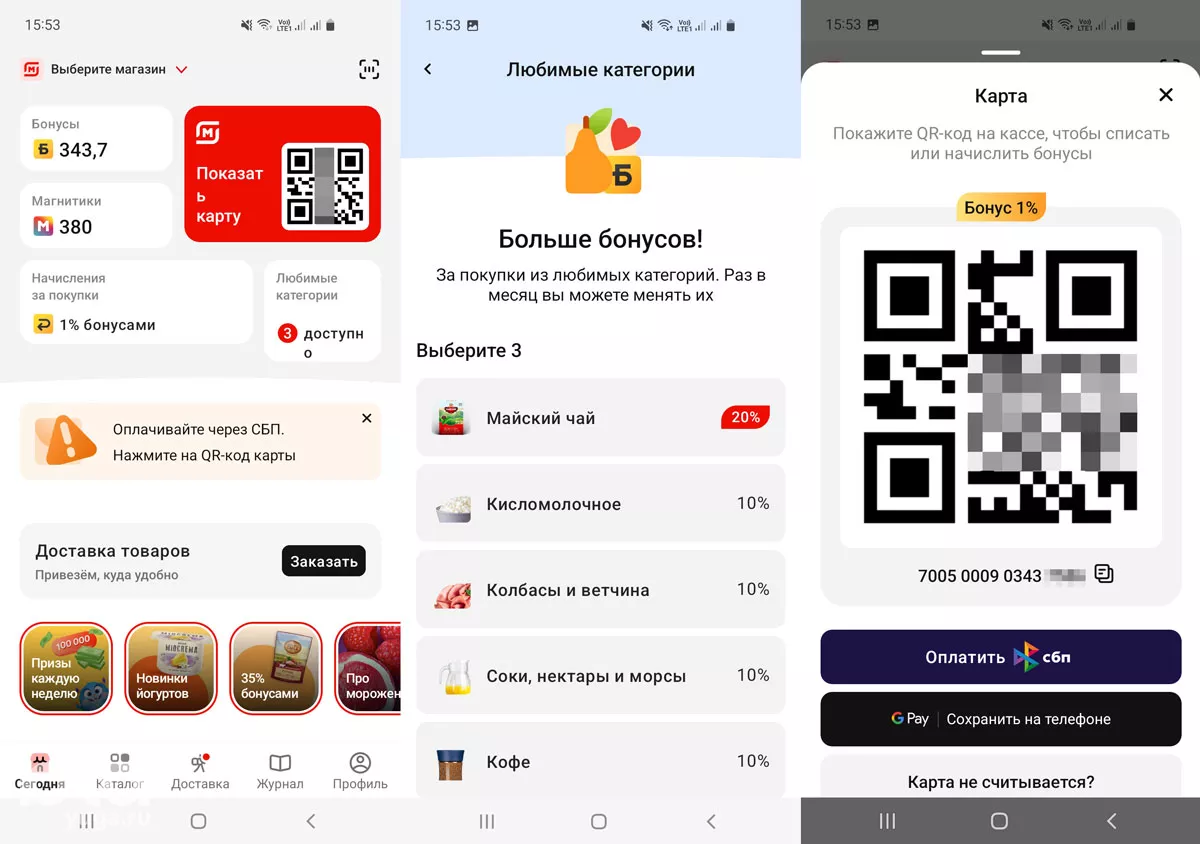 На главном экране есть кнопка «показать карту» кассиру, чтобы получить или списать бонусы. А еще тут можно выбрать три любимые категории, за которые начисляется повышенный кешбэк — 10%. У меня это «Мягкие сыры», «Твердые сыры» и «Колбасы и ветчина». Менять категории можно раз в месяц.