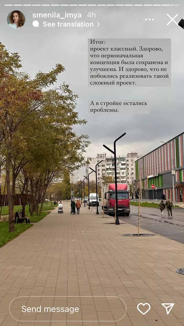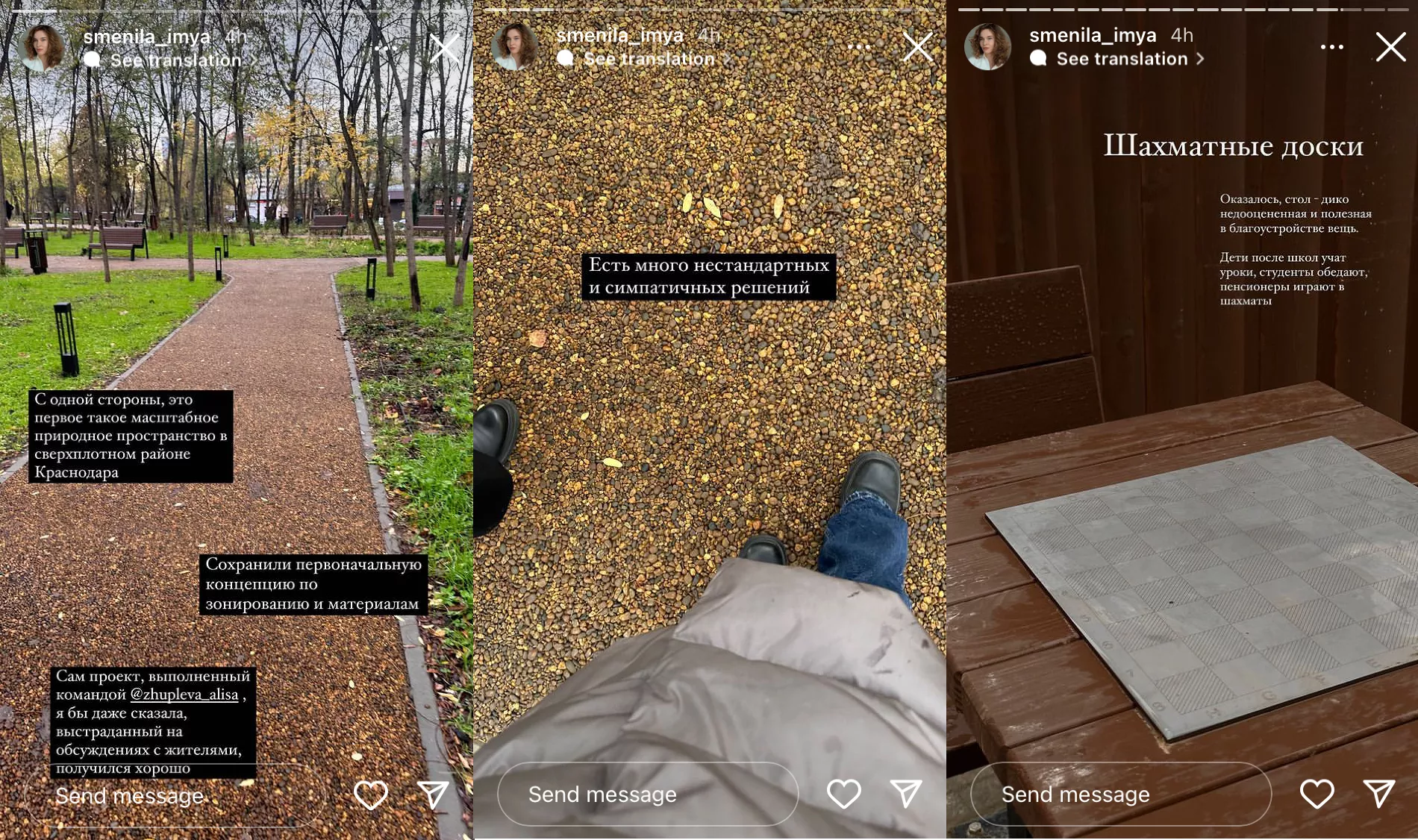 «С одной стороны, это первое такое масштабное природное пространство в сверхплотном районе Краснодара. Сам проект, выполненный командой Алисы Жуплевой, я бы даже сказала, выстраданный на обсуждениях с жителями, получился хорошо. Есть много нестандартных и симпатичных решений. Но качество… качество… Это только что сданный объект. Надеюсь, проведут дефектовку и исправят», — рассказала архитектор.