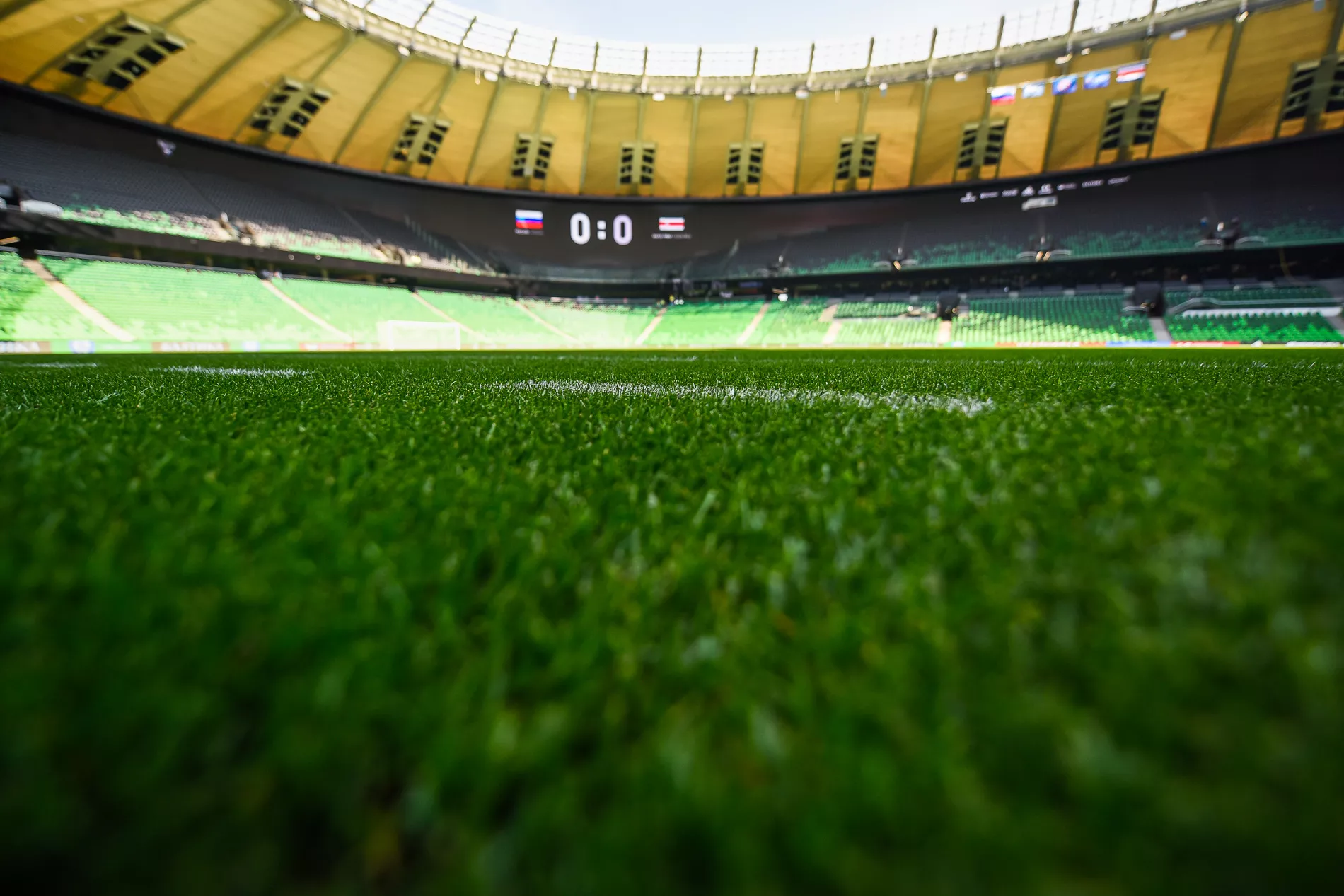 Поляна на краснодарской арене имеет регламентированный размер 105х68 м. Поле оборудовано не только дренажем, но и системой обогрева и охлаждения газона, принудительной аэрации и автоматическим поливом
