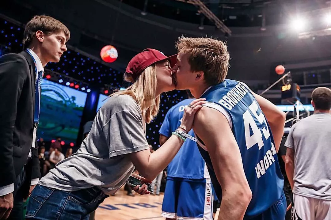 А это поцелуй на удачу от девушки Брокхоффа во время Матча всех звезд Единой лиги ВТБ. Тогда Райан занял второе место в конкурсе трехочковых.
