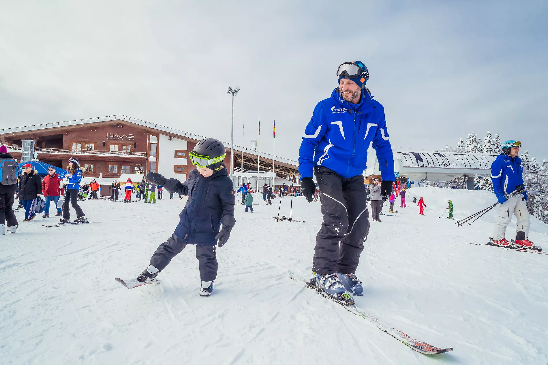 Кататься всей семьей можно на специальных трассах. Перед этим ребенок научится стоять на сноуборде или лыжах с инструктором. На занятия принимают детей от 3 лет.