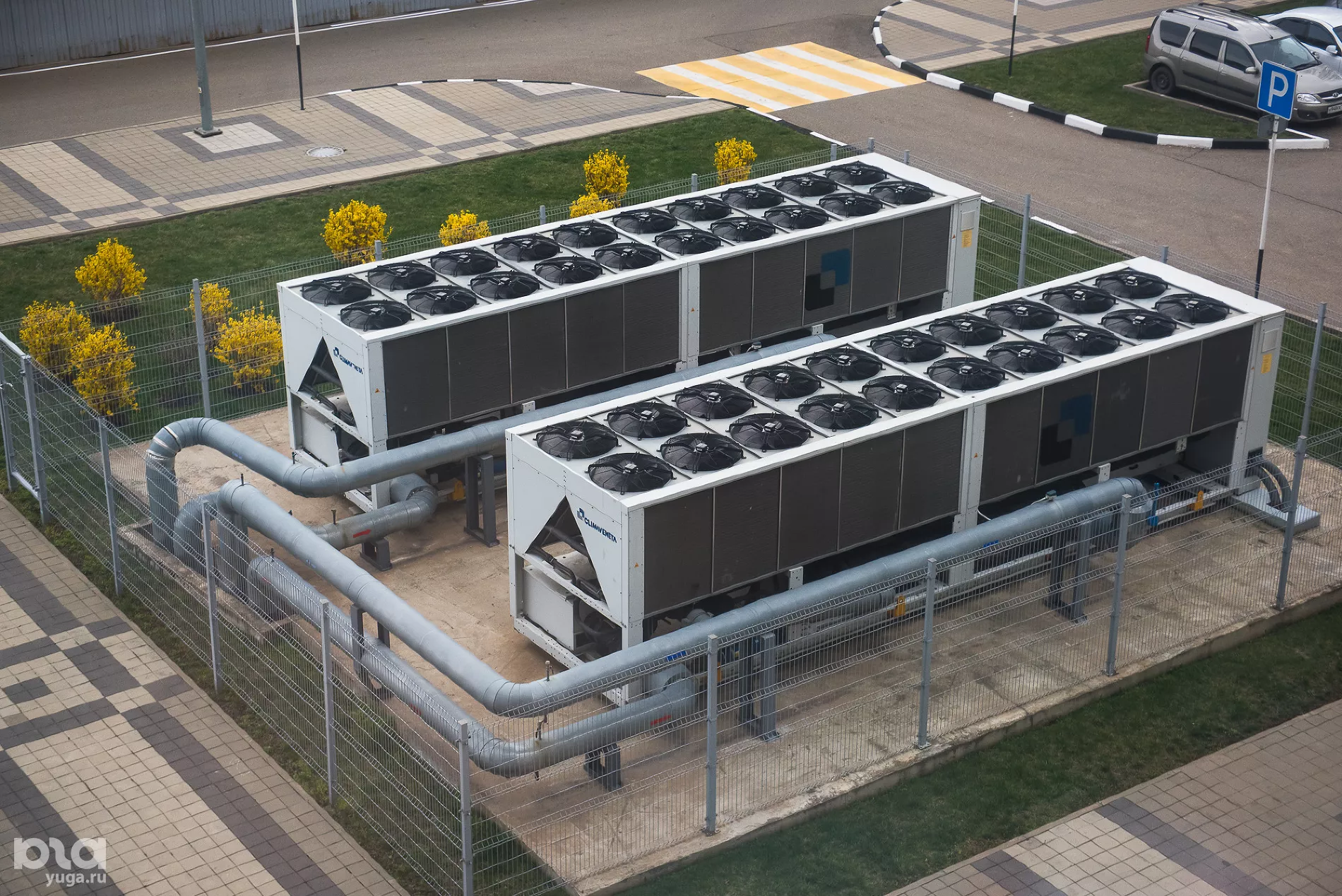 Для того чтобы в «Баскет-холле» было комфортно находиться и зимой и летом, здание пронизано трубами, которые обеспечивают приточно-вытяжную вентиляцию. Кроме того, возле арены стоят два огромных чиллера — это холодильные установки, используемые для кондиционирования помещений больших масштабов.