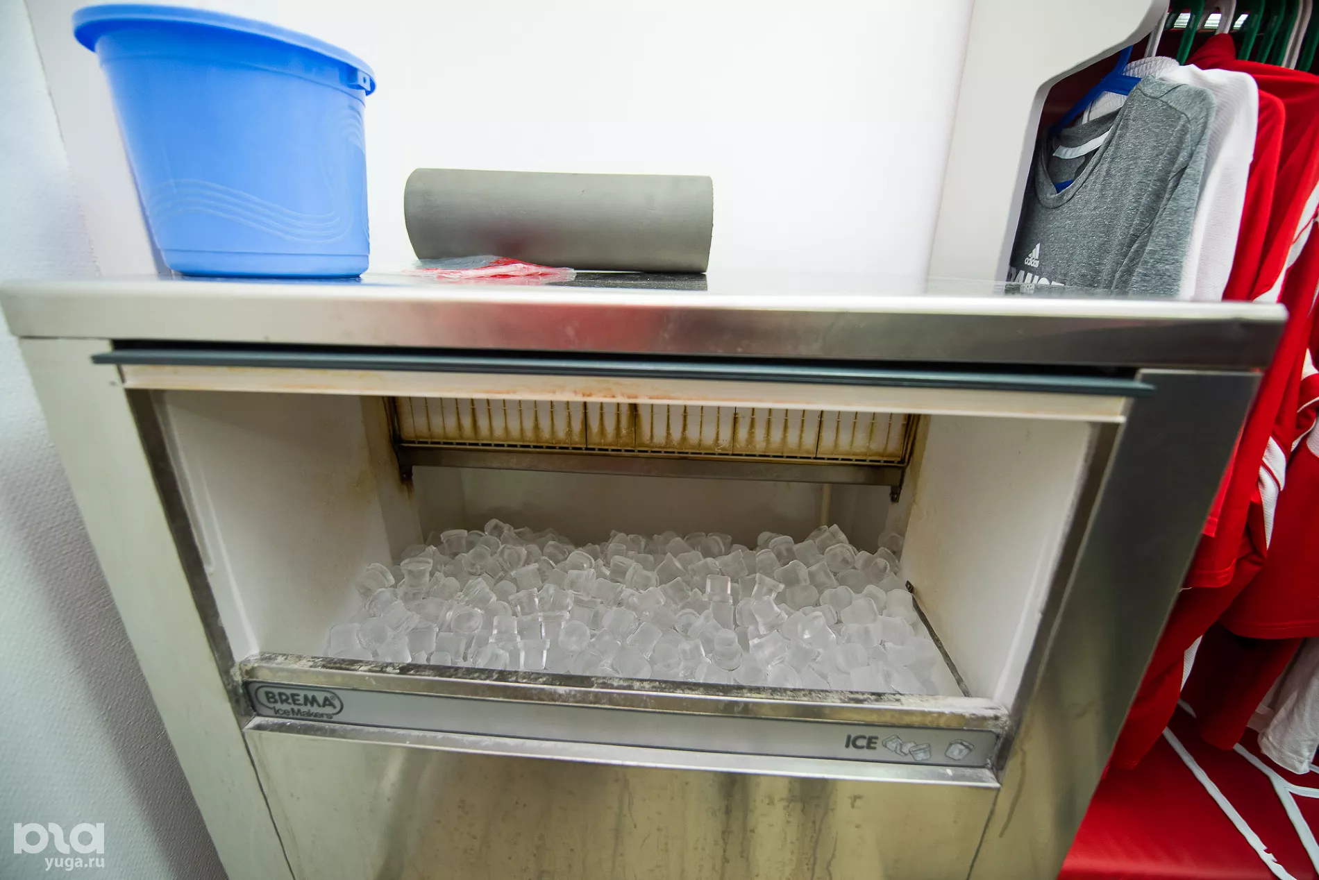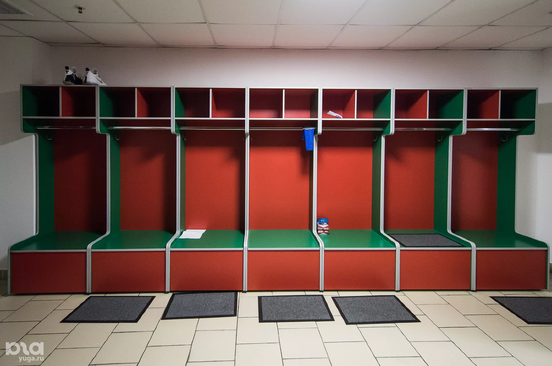 Раздевалка гостей выглядит аскетичнее в плане дизайна, но в ней тоже есть все необходимое для игроков. Такие же шкафчики для одежды, душевое отделение, генератор льда, массажный стол, полотенца, питьевая вода.