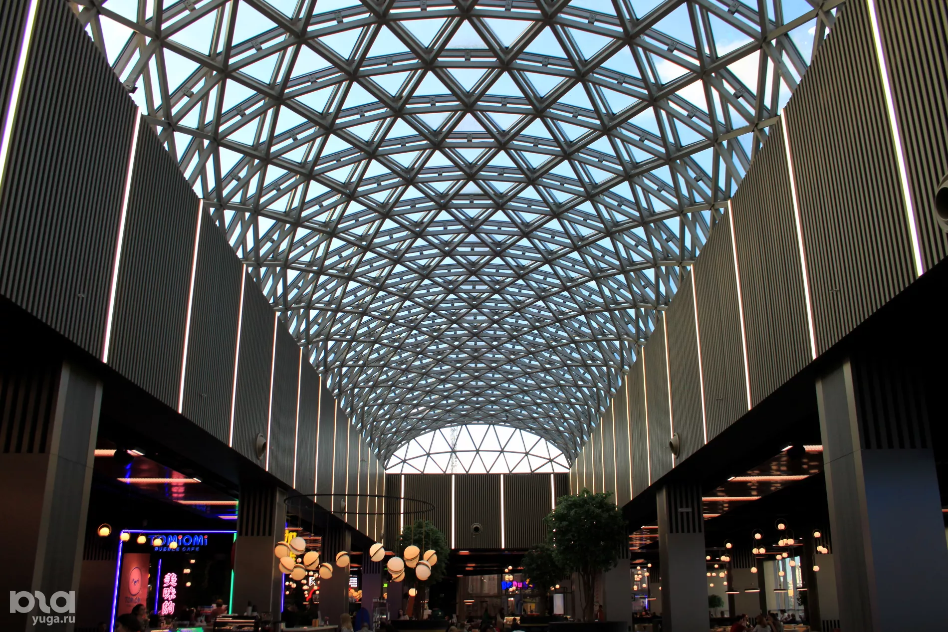 Прозрачный потолок заключен в металлические решетки и этим напоминает гиперболоид Шуховской башни 1935 года постройки, стоящей как раз за «Галереей» на пересечении улиц Рашпилевской и Головатого. На эту архитектурную отсылку, кажется, намекает и хэштег в начале названия фудхолла (#).