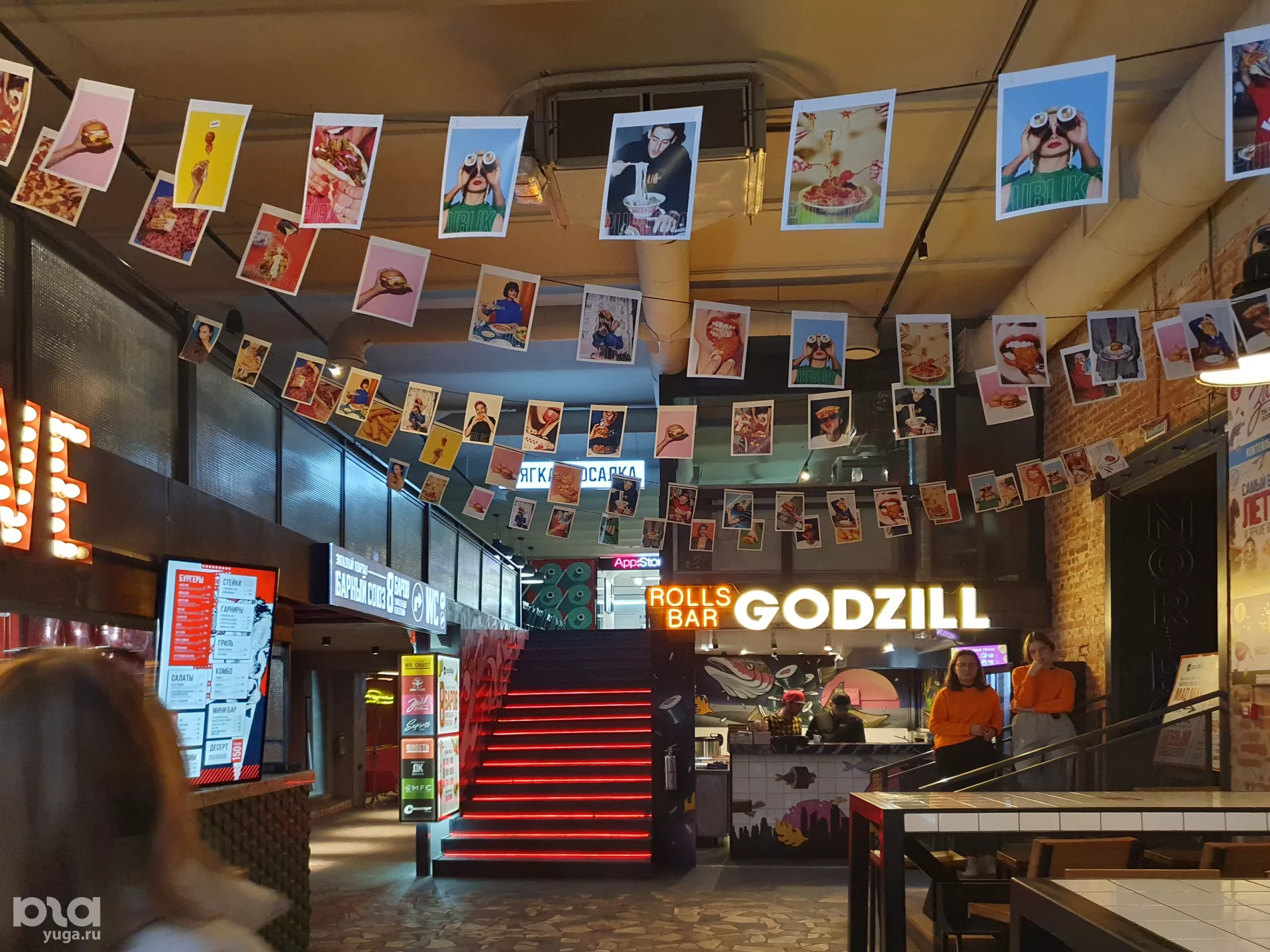 Сюда стекаются перекрестные потоки горожан с остановок общественного транспорта с улиц Красной и Коммунаров, магазинов «Центра города» и ближайших жилых комплексов. Несмотря на то, что это самый большой фудхолл в Краснодаре (8 тыс. кв. метров на 1100 посадочных мест), на входе сразу ощущается многолюдность и фоновый гул.