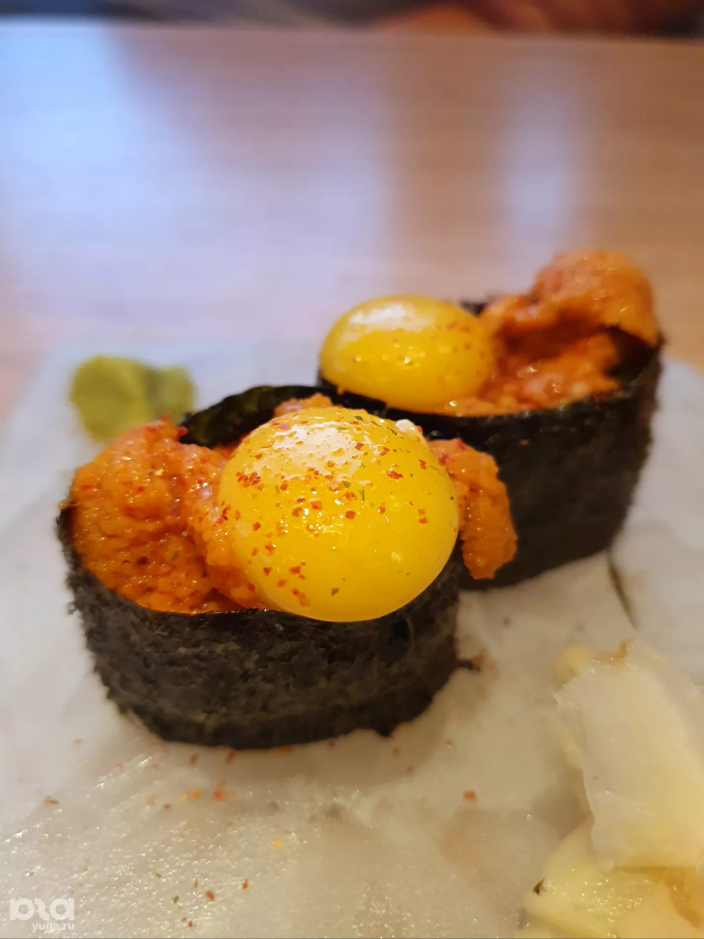 Меню лаконичное, в основном готовят японские закуски и десерты: окинавские пончики с топпингами, моти, сэндвичи, суши донаты (в форме пончика) и онигири.
