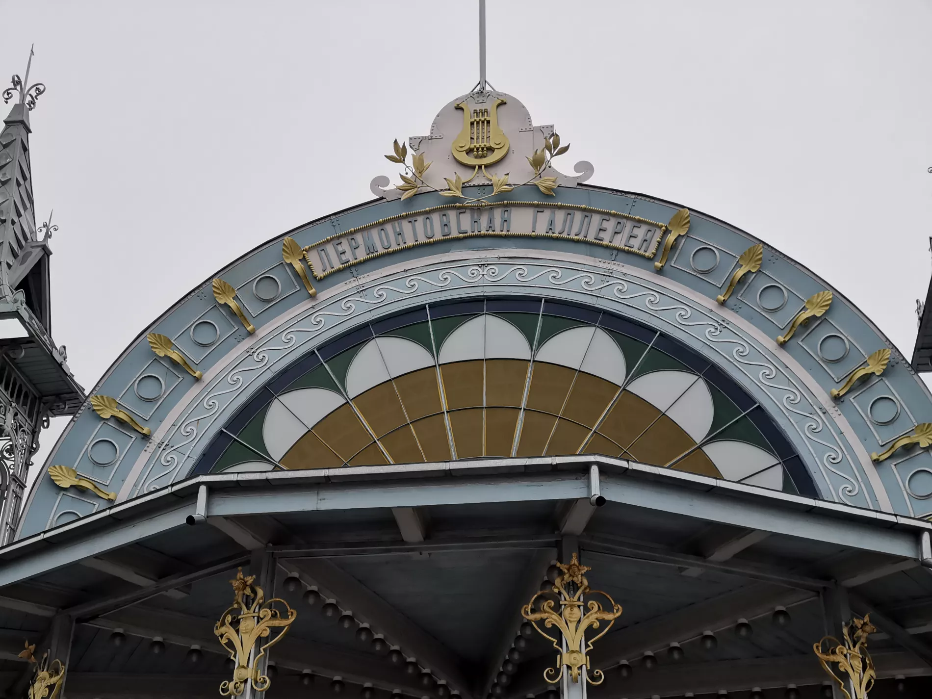 От скромного дома поэта отправимся к масштабному архитектурному сооружению имени Лермонтова — Лермонтовской галерее в парке Цветник. Пройти нужно всего 500 метров. Перед вами удивительно выбивающееся из пятигорского пейзажа здание. Галерею в стиле эклектики и модерна с разноцветными стеклами и многочисленными коваными элементами построили спустя 60 лет после смерти Лермонтова, в 1901 году.