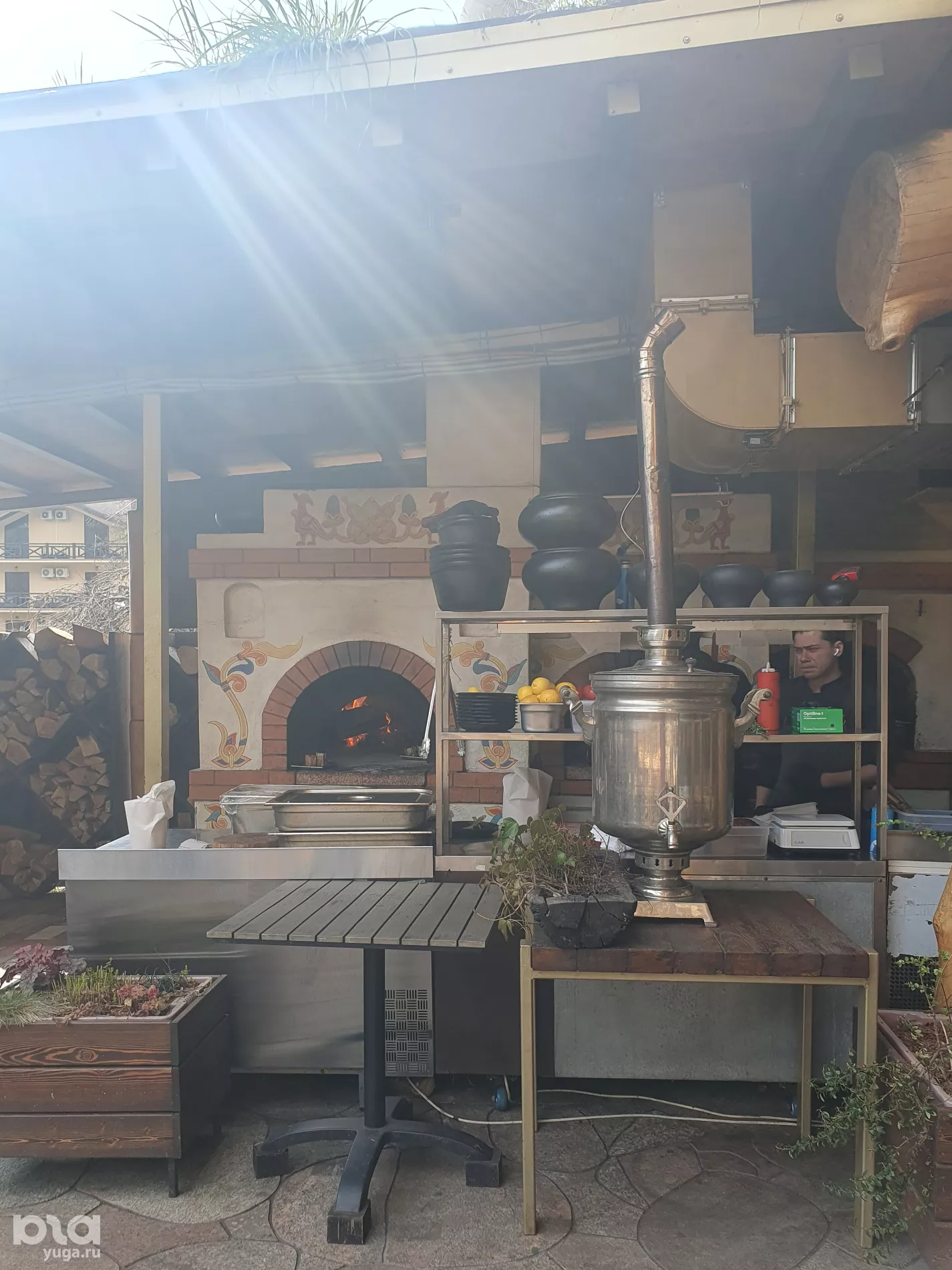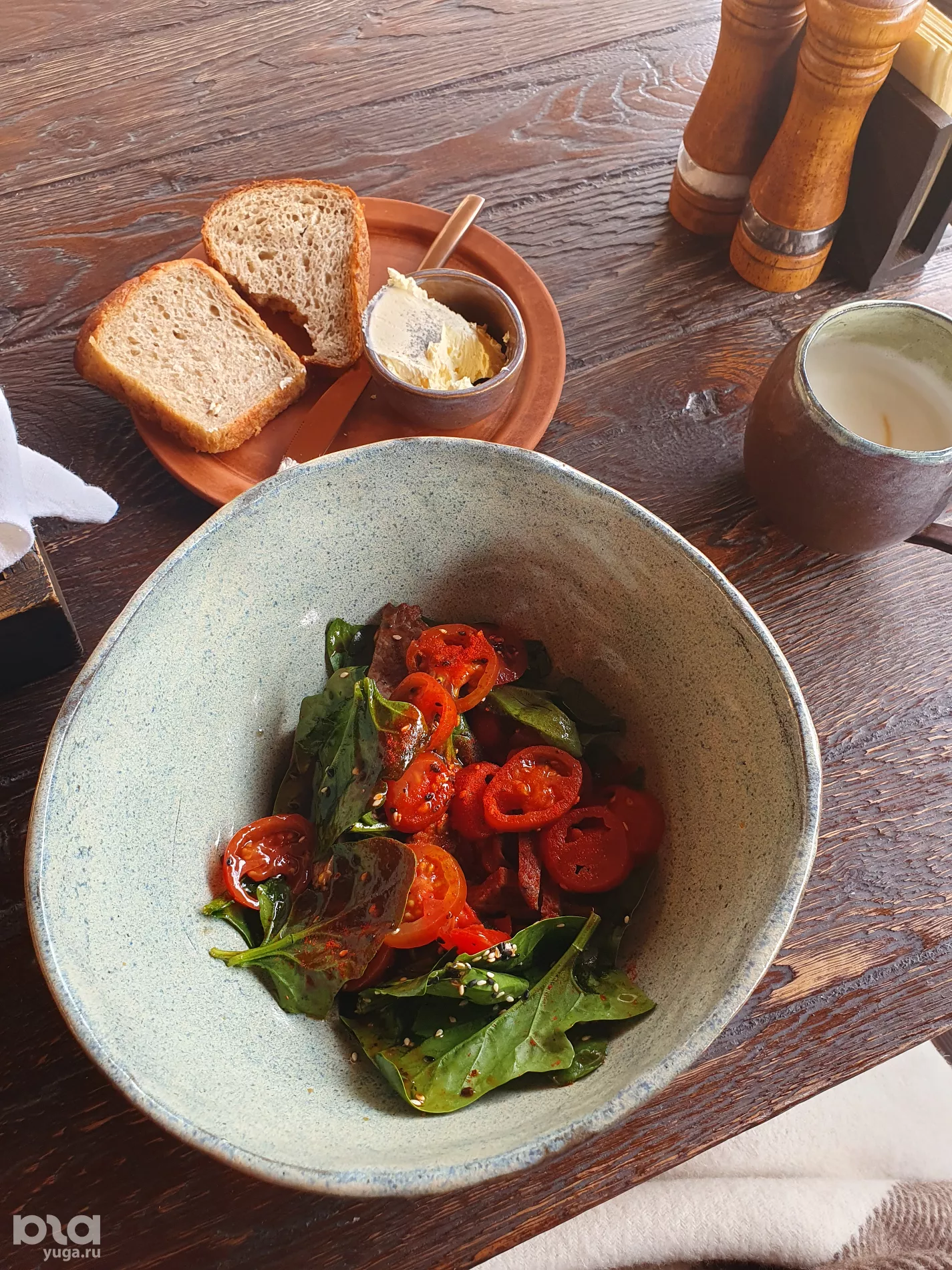 В заведении готовят авторские блюда русской кухни — простые и без пафосных изысков. Пока ждете заказ, прогуляйтесь по террасе: найдите теплицы с зеленью, крыши с газоном, русскую печь. Внутри ресторана глиняные стены вручную расписаны фресками, а на втором этаже есть магазин керамики и чайная.