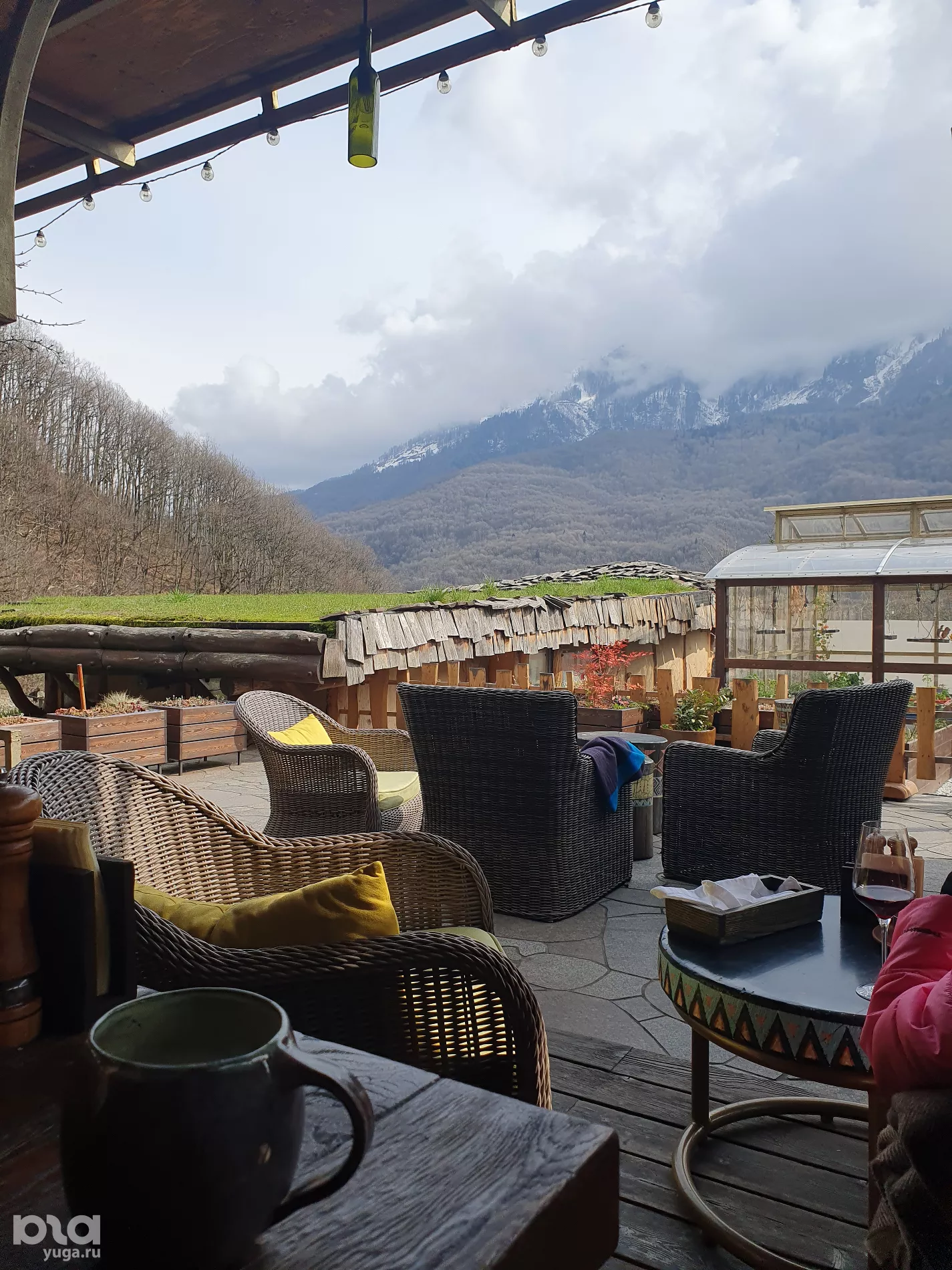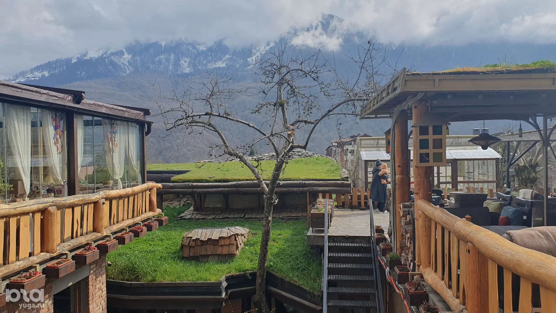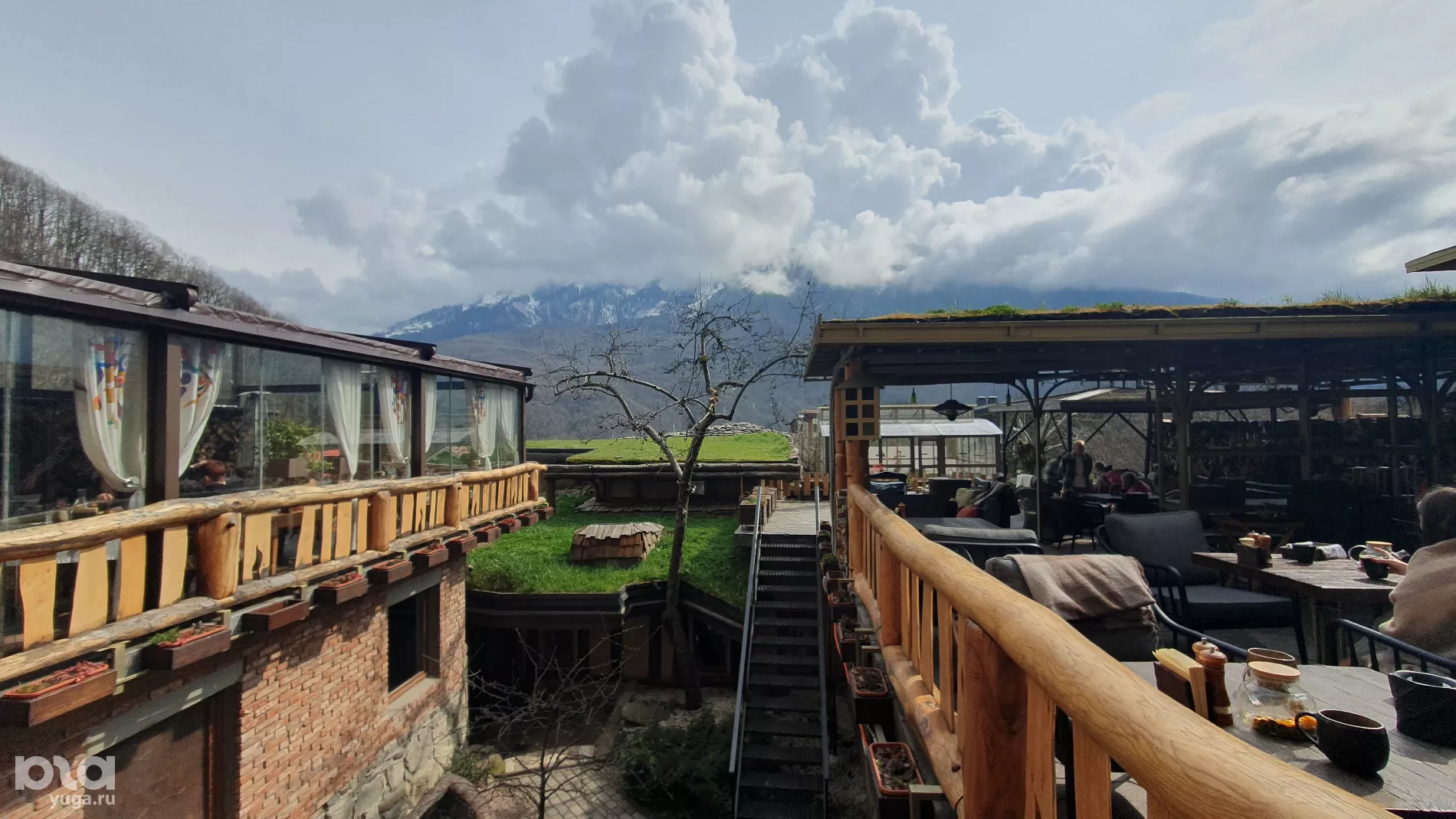 Первая локация — ресторан «Яблоки печем» — доставит сразу два удовольствия: визуальное и гастрономическое. Главная фишка ресторана — вот эта веранда с видом на горы и главную (и пока совсем молодую) яблоню заведения: