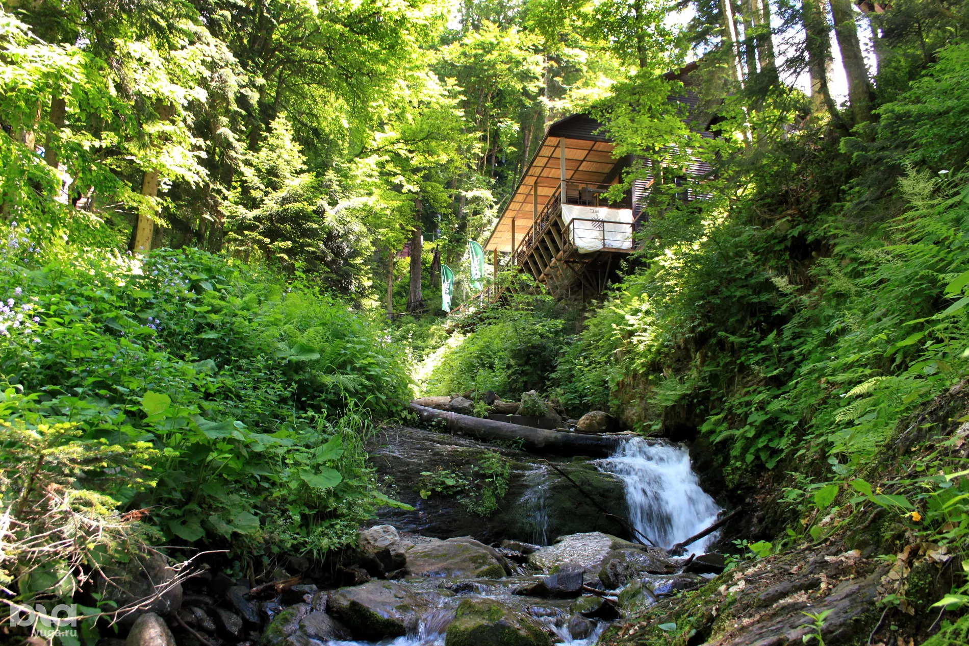 Если вы не поклонник долгих прогулок, можно просто остаться на площадке у начала пеших маршрутов. Демоверсия финальных точек доступна уже в нескольких метрах от канатки. А на террасе здешнего кафе «Лес» можно перекусить с видом на водопад.