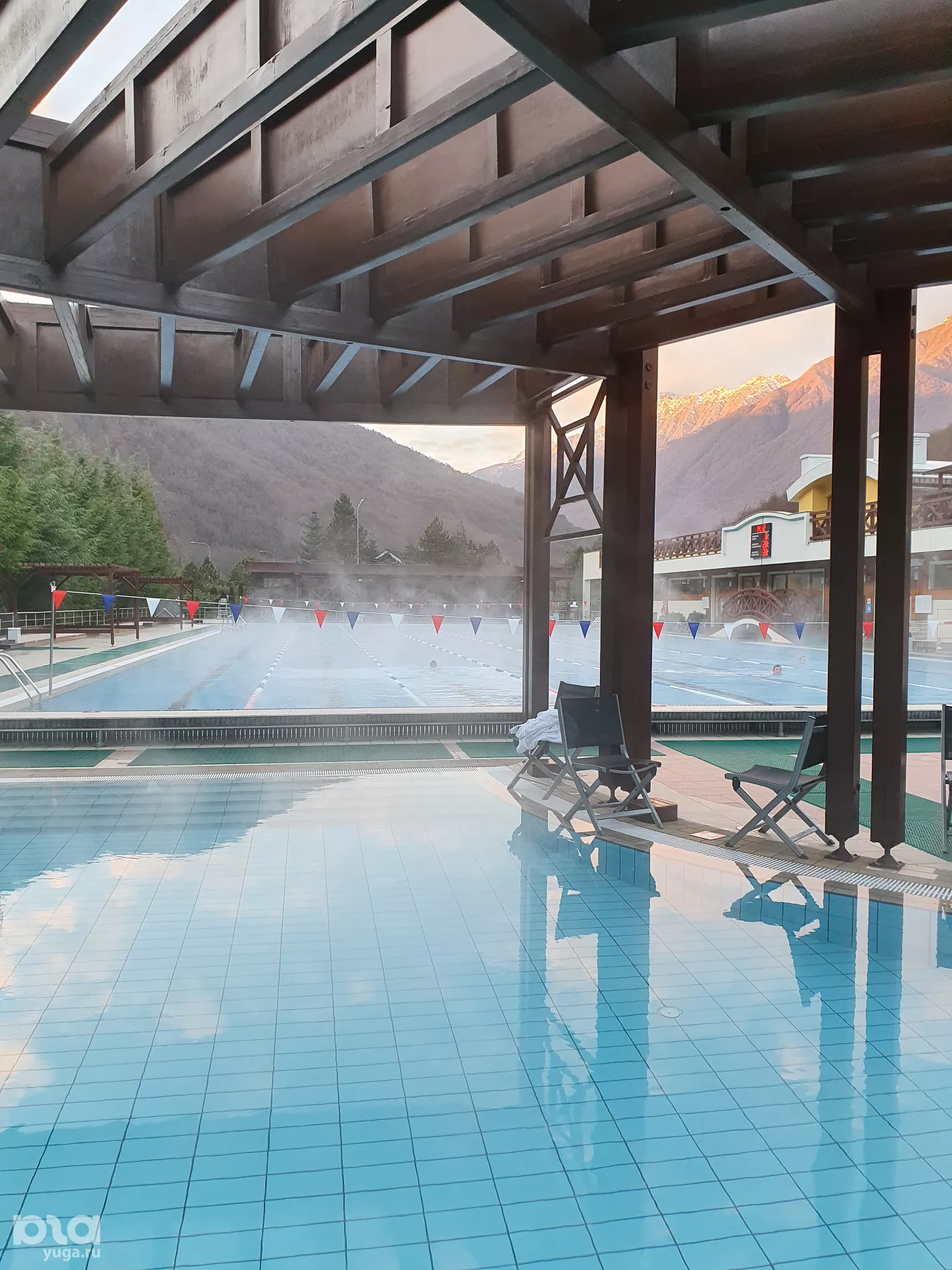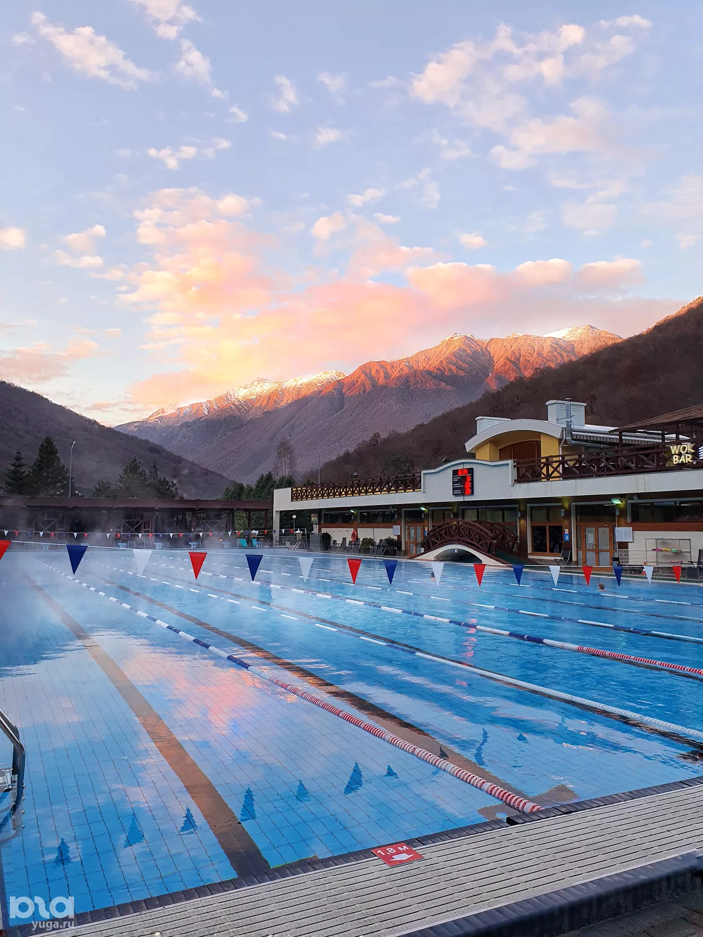 Чтобы поплавать в 50-метровом олимпийском бассейне с видом на горы, достаточно оплатить гостевой визит в спа-зону корпуса С в гостинице «Гранд Отель Поляна» — 3000 за взрослого и 1000 за ребенка 3-12 лет (с 13:00 до 16:00). В билет также входит посещение крытого 25-метрового бассейна, использование ячейки для хранения вещей и полотенце. В раздевалке есть туалет, душ и фен. Все бассейны круглогодично подогревают.