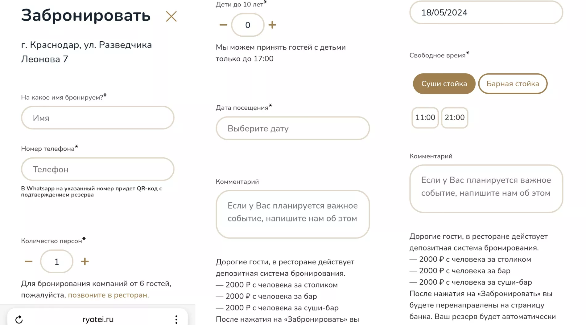 На главной странице сайта ryotei.ru нажмите кнопку «Бронь столов». Введите имя и телефон (на этот номер в WhatsApp* придет QR-код). Внимательно отметьте посетителей: в поле «Количество персон» выбирайте только взрослых и детей старше 10 лет, а в следующем — детей до 10 лет.