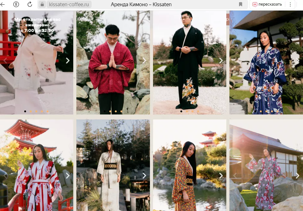 На сайте кофейни представлены 14 кимоно разных расцветок, в том числе мужские наряды: