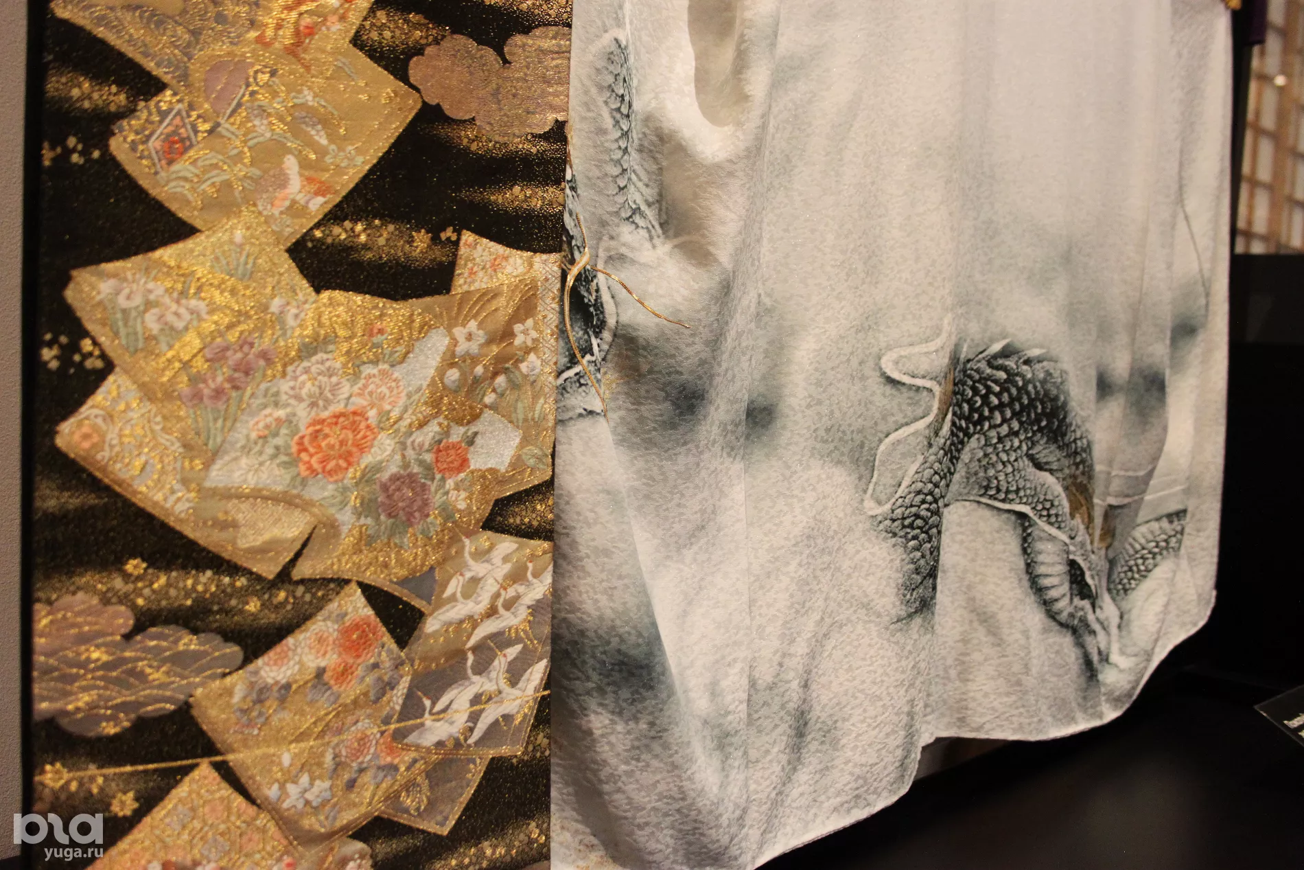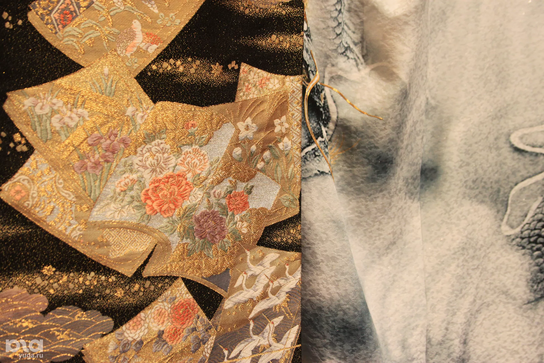 По разные стороны зала расположили два полотна с винтажным шелковым кимоно ручной работы (периода Сёва (1952-1989) эпохи Гэндай, длящейся по наши дни).