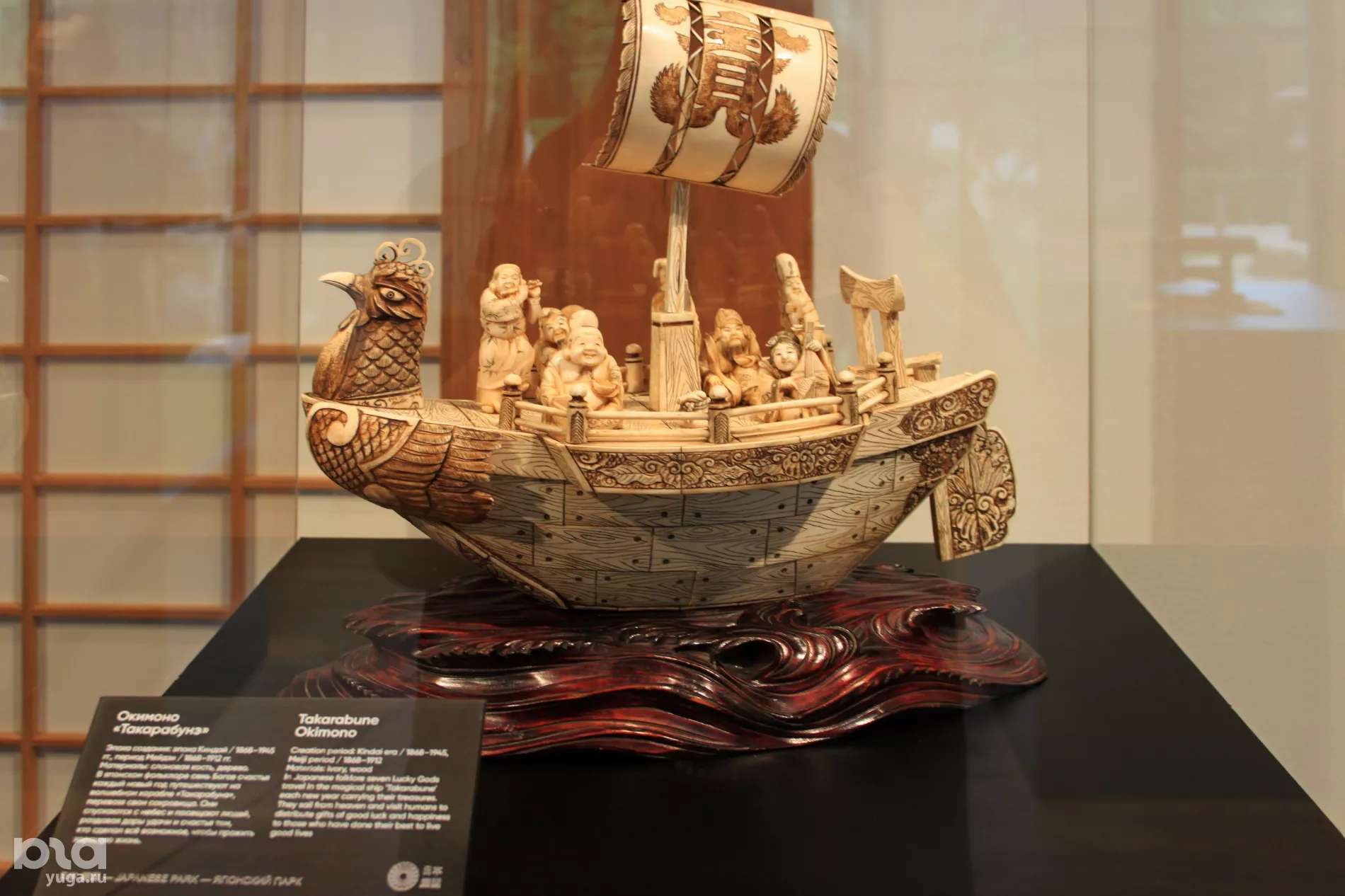 В зале в стеклянных боксах хранятся резные статуэтки — окимоно, в основном из слоновой кости и дерева. Одна из таких — лодка с семью фигурками нэцкэ — изображает летучий корабль сокровищ «Такарабунэ». Согласно японской мифологии, каждый новый год он спускает с небес семь богов счастья, которые раздают сокровища достойным.