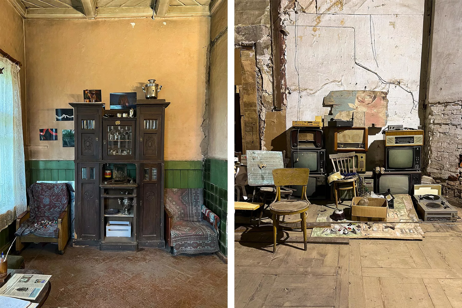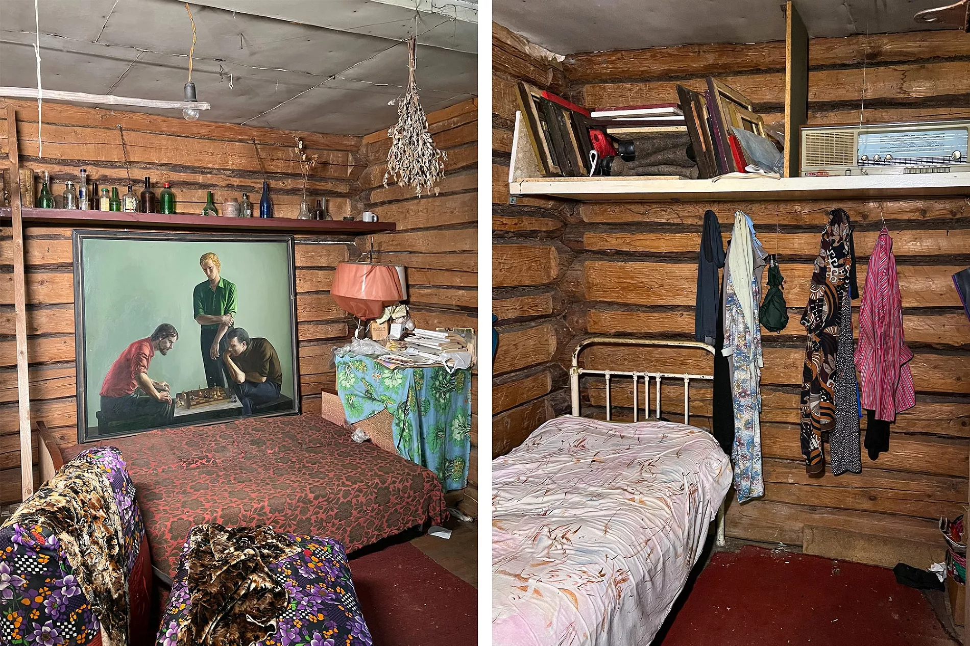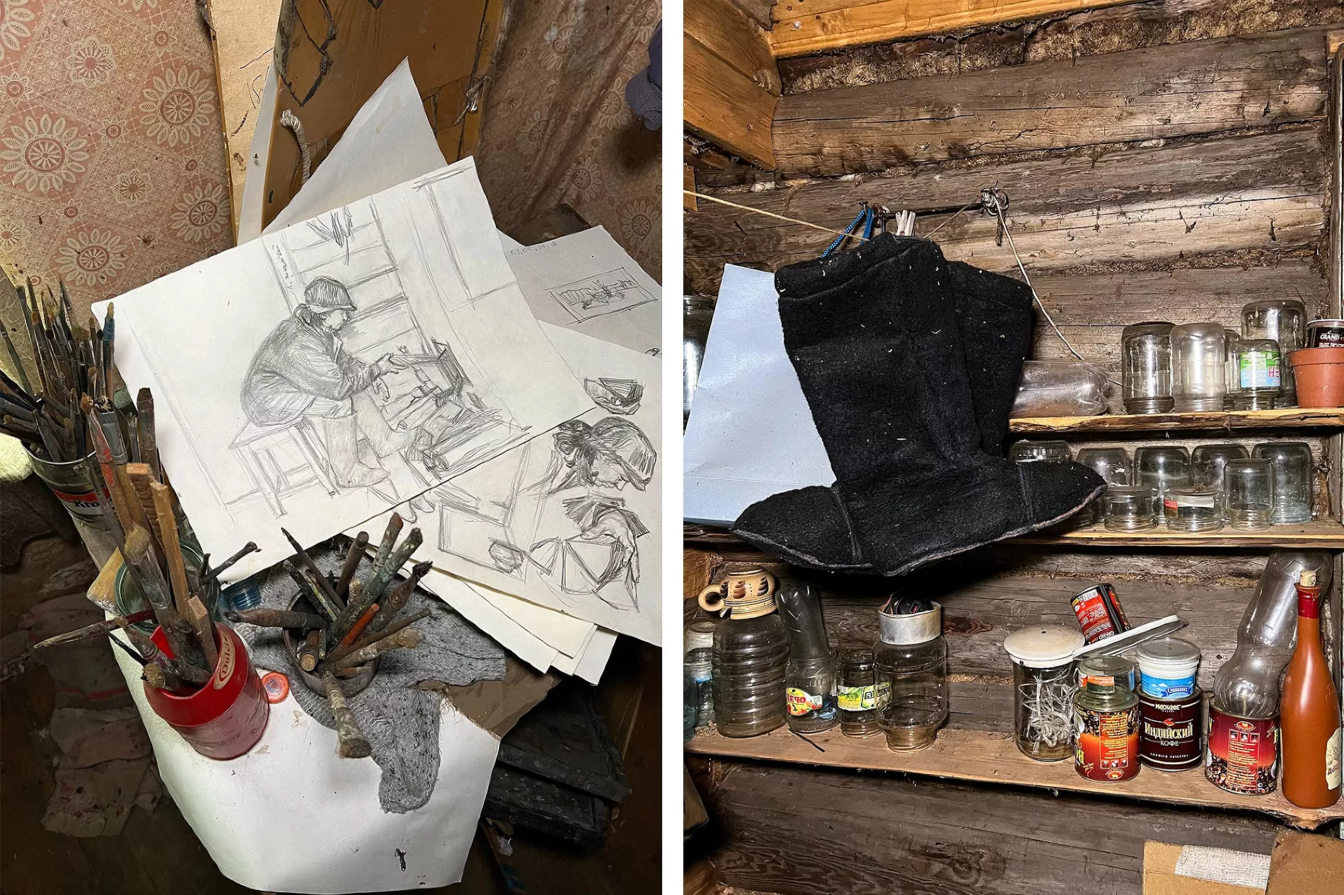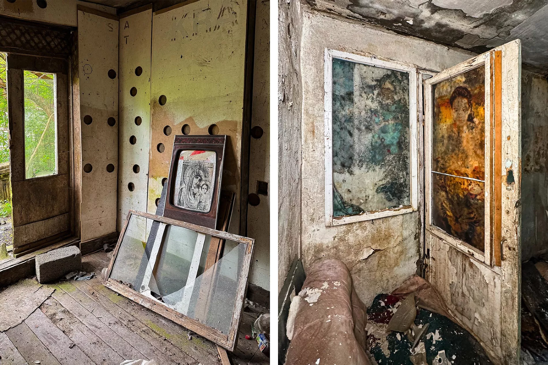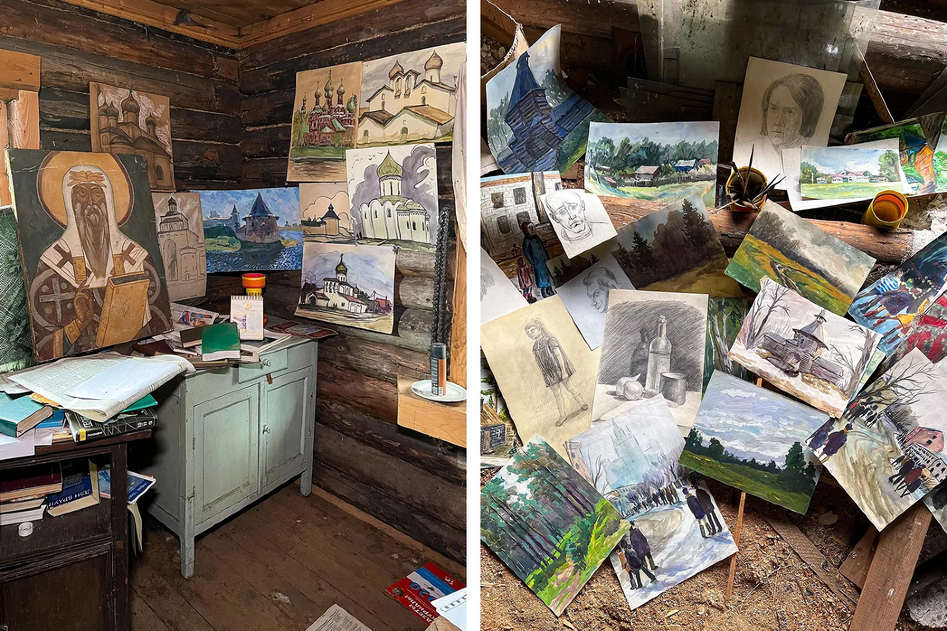 У одного из домов оказалось две входные двери. На одной — замок, а на второй он был сорван. Мы потянули за ручку — дверь поддалась. То, что мы увидели внутри, повергло нас в шок: весь дом был буквально завален картинами и рисунками. Сразу стало ясно — здесь жил художник.