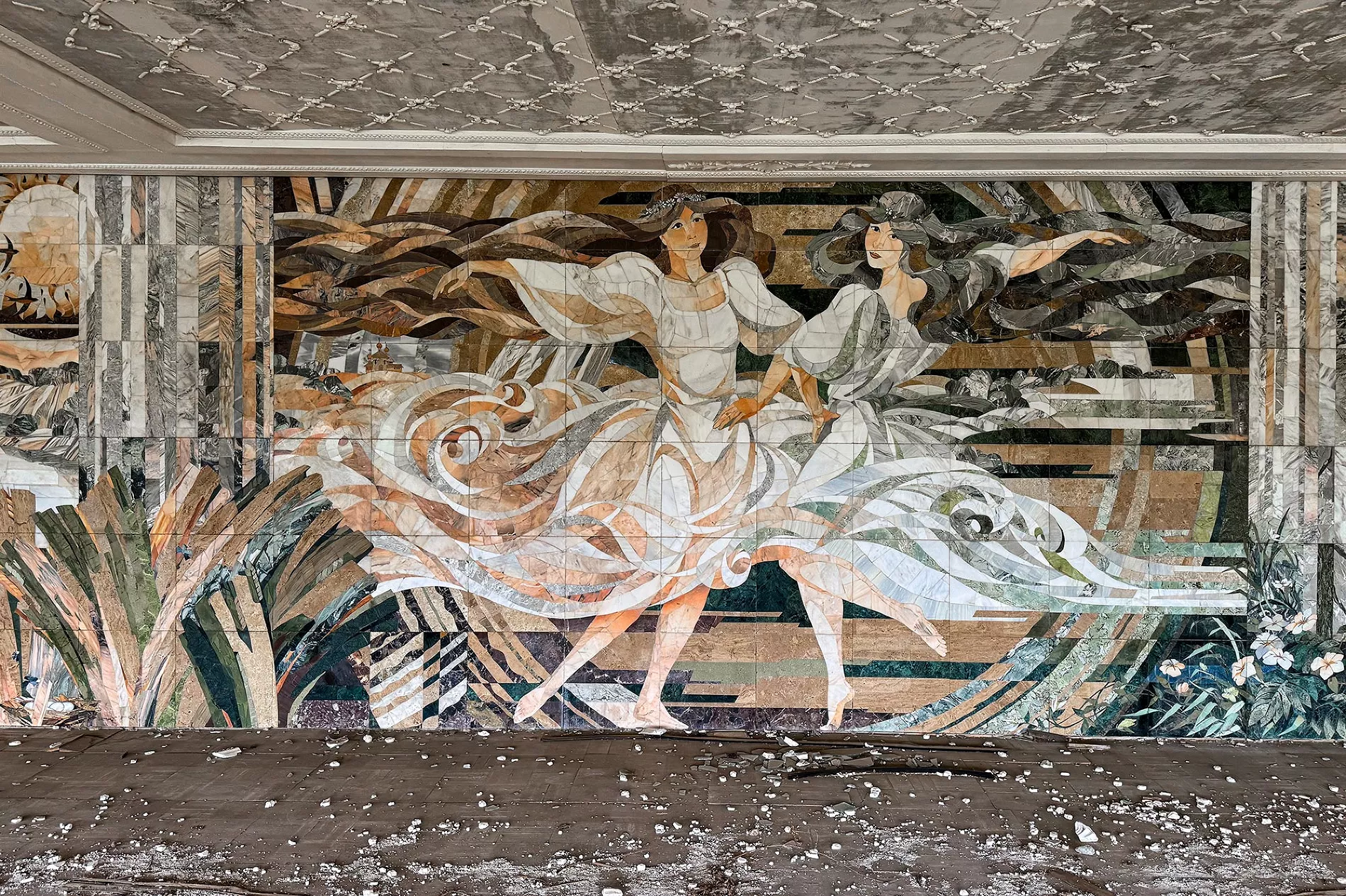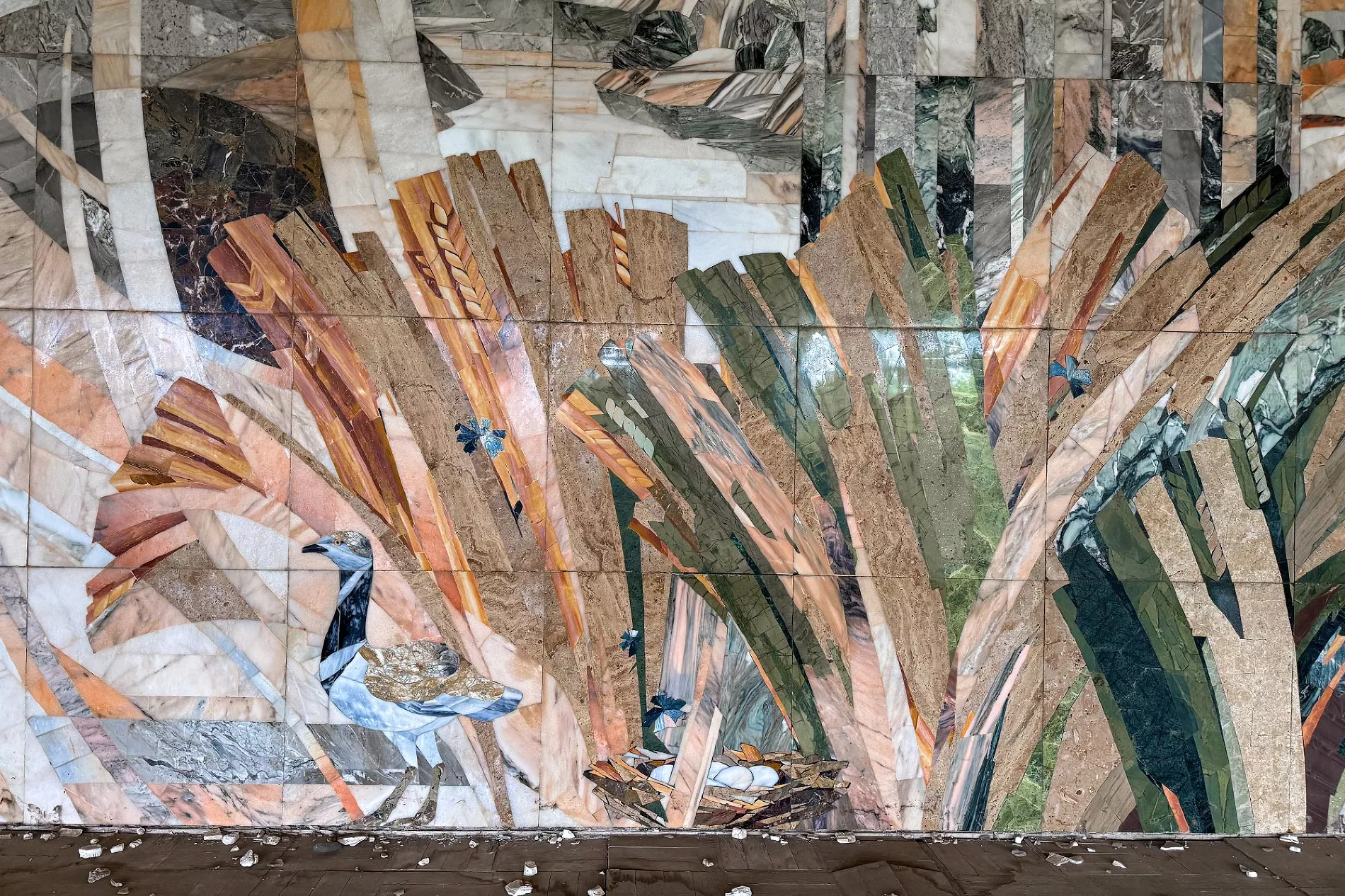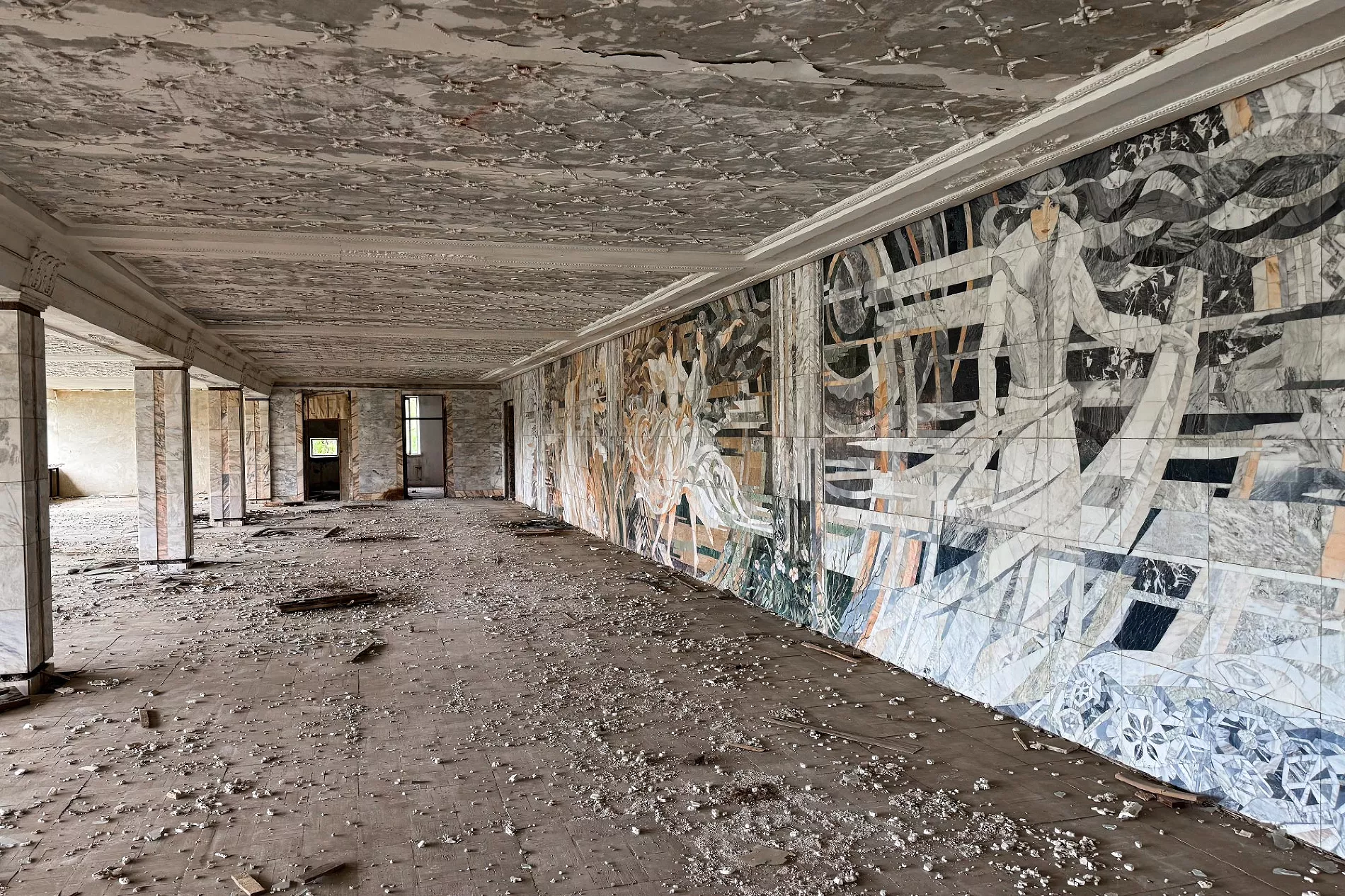 Но посреди этого увядания скрывается настоящее сокровище, которое время, кажется, не тронуло. Это великолепное мозаичное панно 1992 года, посвященное временам года. Глядя на него, я думала о том, что это удивительное произведение мастеров Лобанова, Клементьева и Карлова теперь могут оценить лишь редкие гости. Позже я узнала, что судьба панно волнует не только меня: местные активисты ищут способ его спасти, демонтировать и перенести в безопасное место. Это дает надежду, что сокровище Новоберезанского не исчезнет бесследно.