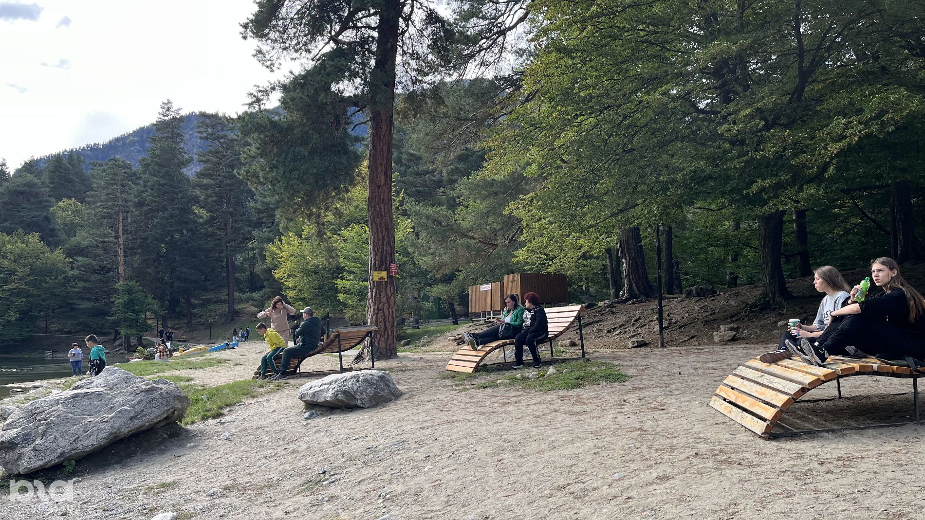Вместо кофе официант порекомендовал взять чай с шишками и медом. Устроились на уличных качелях под навесом: капли отбивали ритм по крыше, а мы, как два мокрых кота, грели руки о кружки и любовались туманом, сползающим с гор. Вечером, на обратном пути, мы застали здесь большие компании у костра — очень уютно.