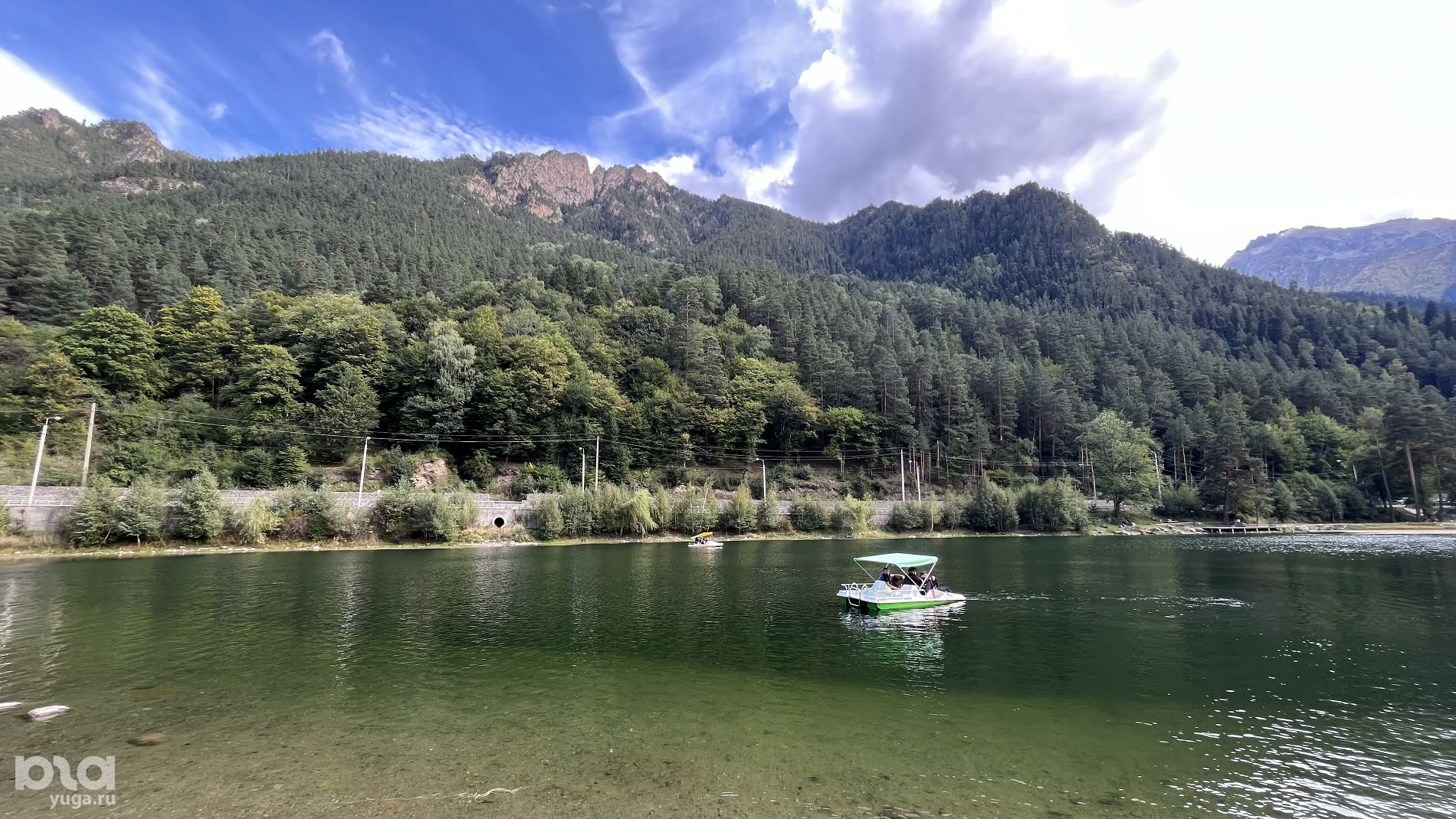 Туманлы-Кель переводится с карачаевского как «туманное озеро»: вода в нем прогревается до +20°C, поэтому в утренние и вечерние часы над поверхностью стелется молочно-белая пелена. Мы же застали достопримечательность в середине дня в «неглиже».