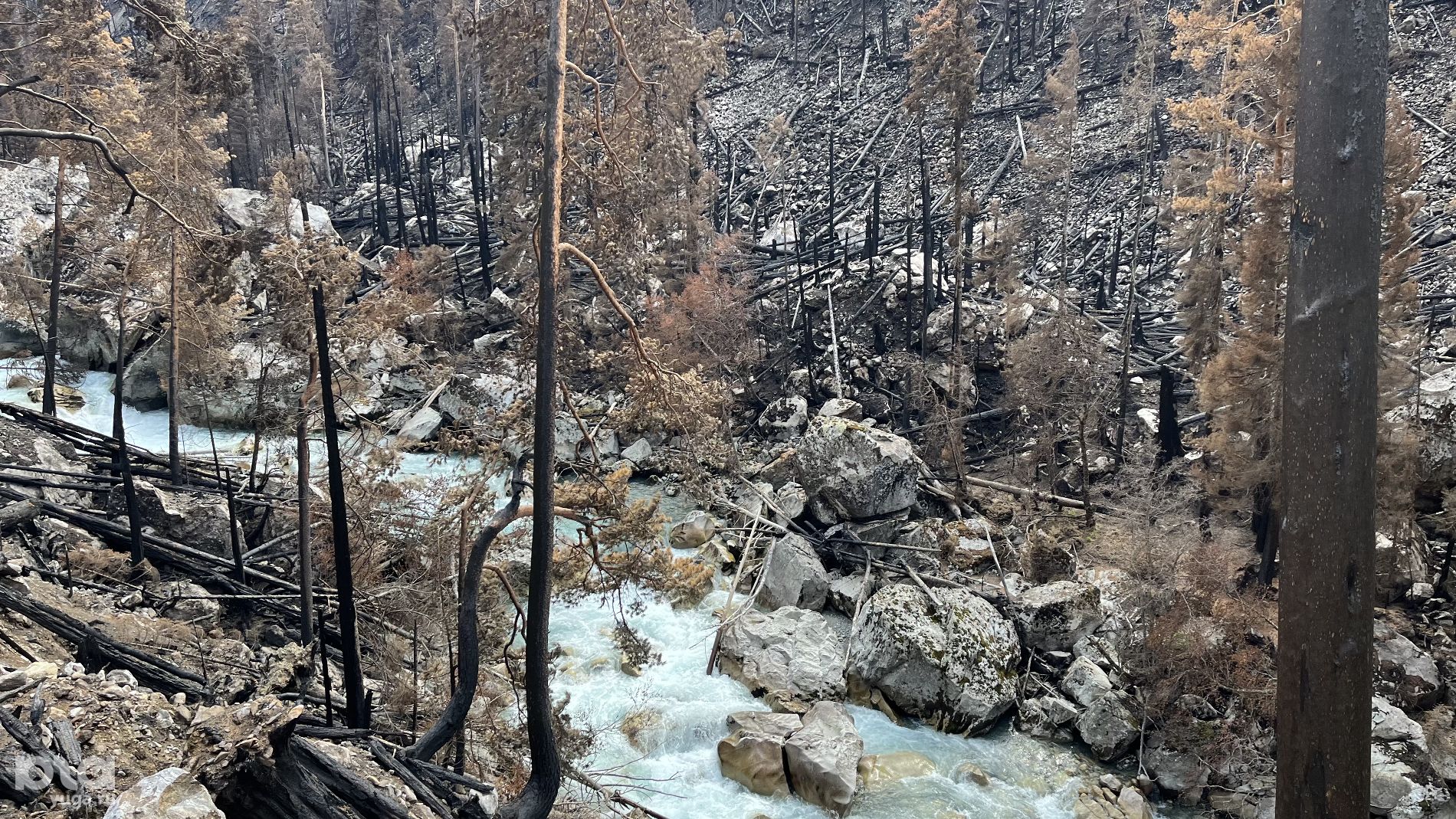 Путь тянется вдоль реки Гоначхир через апокалиптический, душещипательный пейзаж: вместо зеленых сосен голубую воду обрамляет частокол обугленных поваленных стволов, повсюду черная сажа. Масштабы пожара поражают — 15 гектаров выгоревшего леса. Но на подъезде к озеру лес набирает свои естественные живые краски.