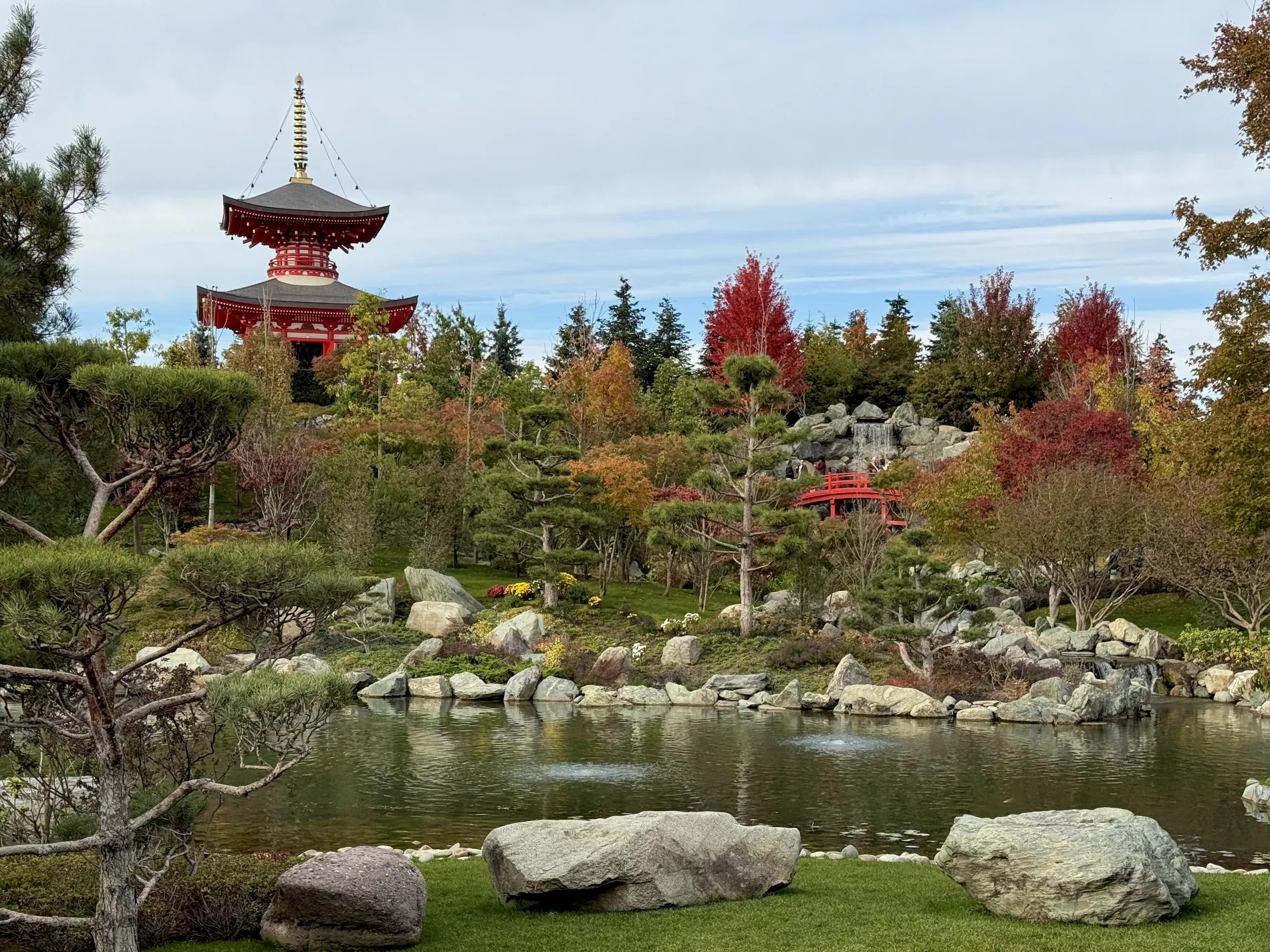 Особенно эффектно на фоне алых вспышек выглядят берега зеркального пруда и дорога к красному мостику у большого водопада.