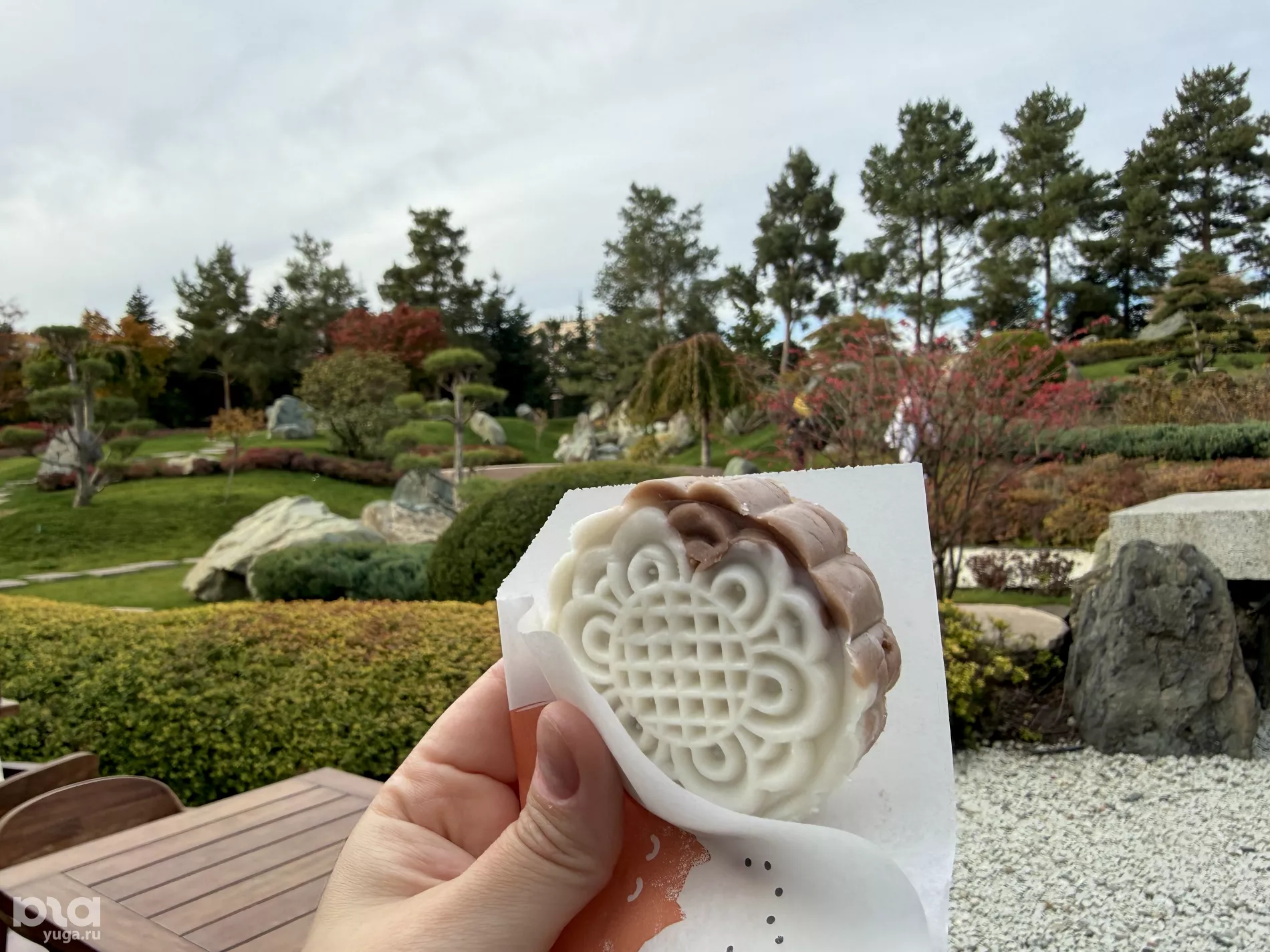 В сет кофейни Kissaten, которая «провела» нас в сад без очереди, входил сезонный десерт — мункейк с каштановой начинкой. «Лунный пряник» родом из Китая, где его готовят к Празднику середины осени, на вкус нежный и густой, с кусочками каштана и «песочной» ореховой начинкой.
