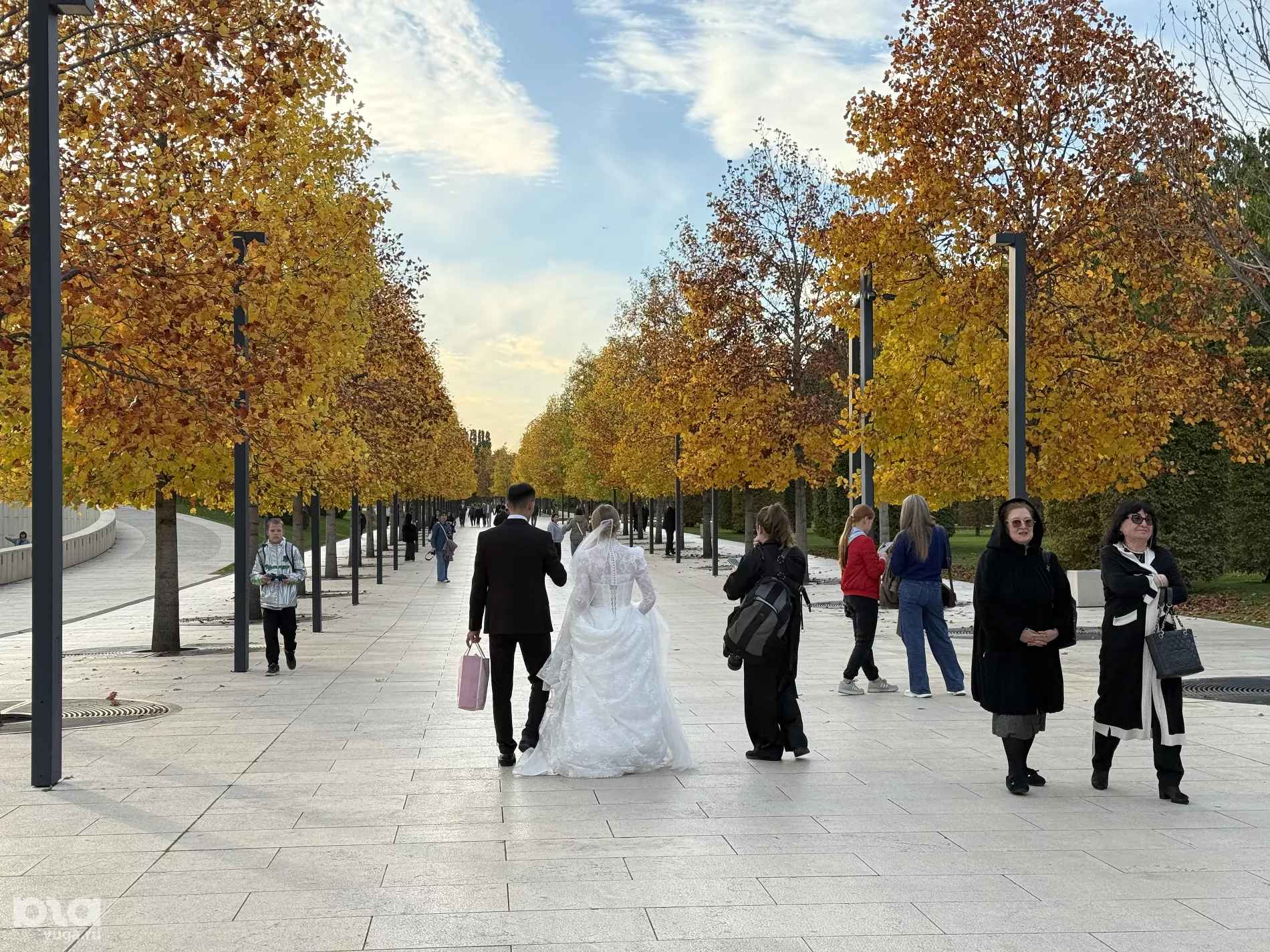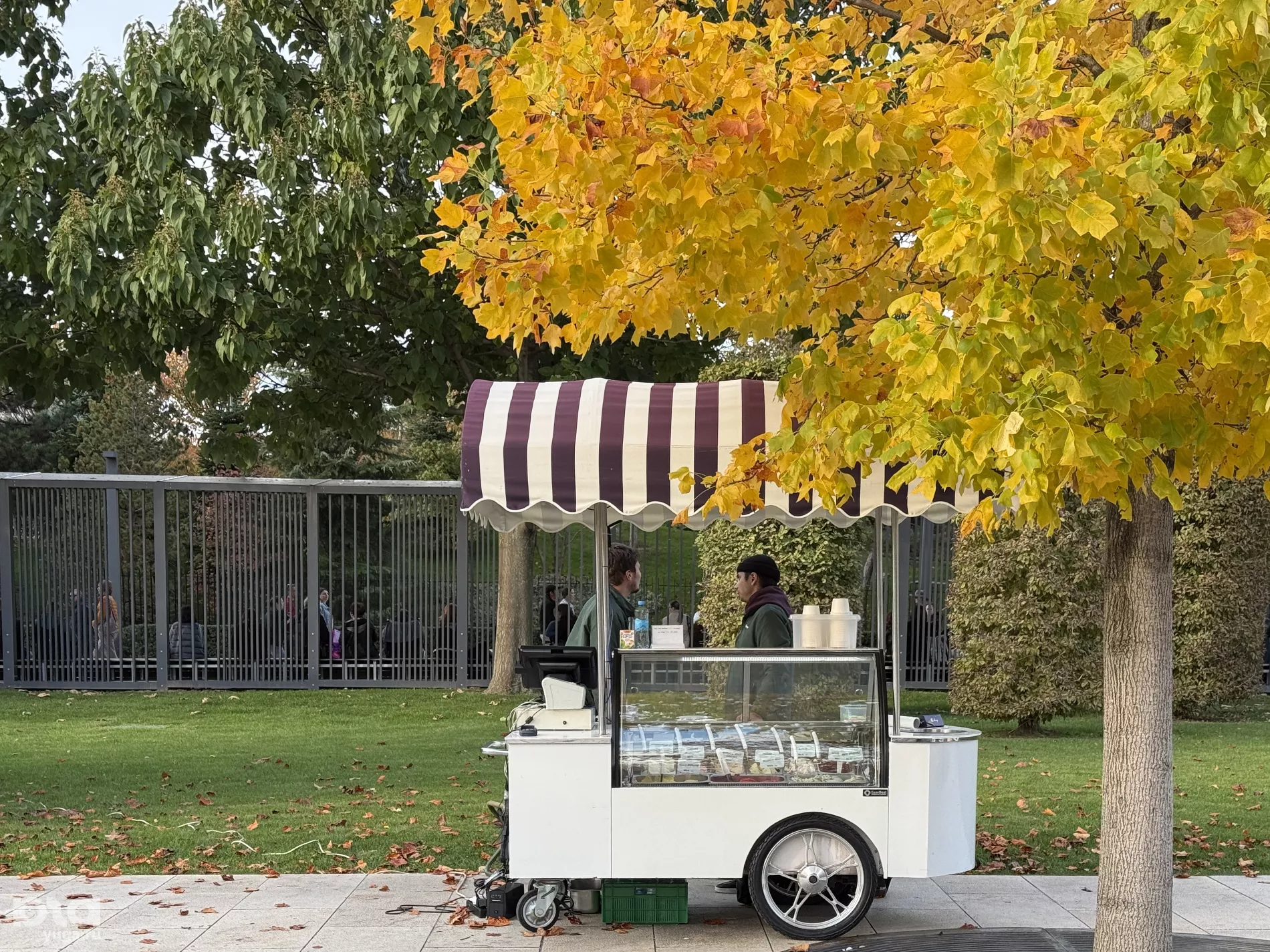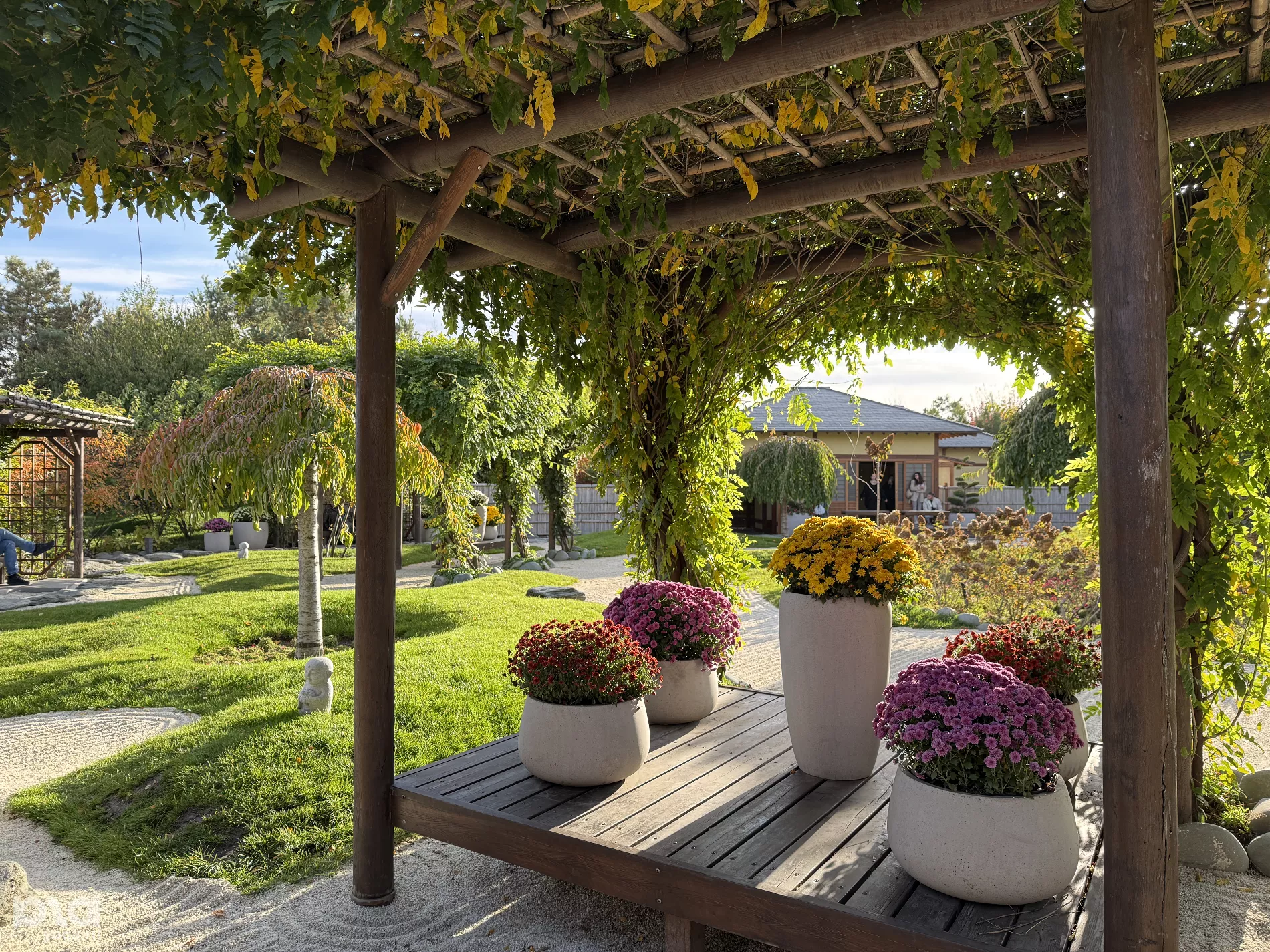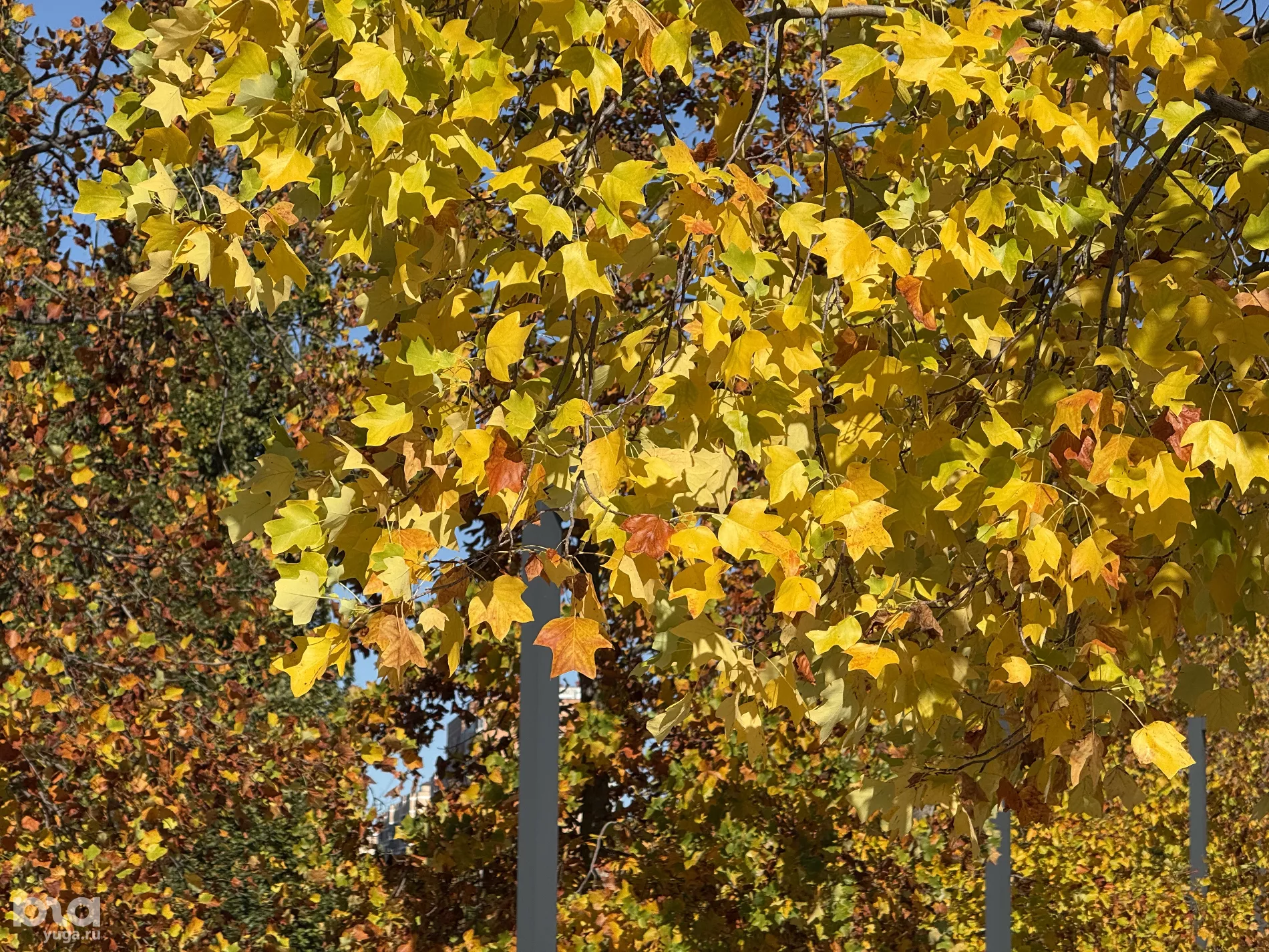 Наша следующая локация — Японский сад. Аллея, ведущая ко входу, уже окрасилась в лимонный цвет. Здесь растут тюльпановые деревья — лириодендроны. На бульваре фотографируются молодожены, а на лужайках устраивают пикники. Тем временем работники парка укрывают теплолюбивые деревья в «космические» теплицы.