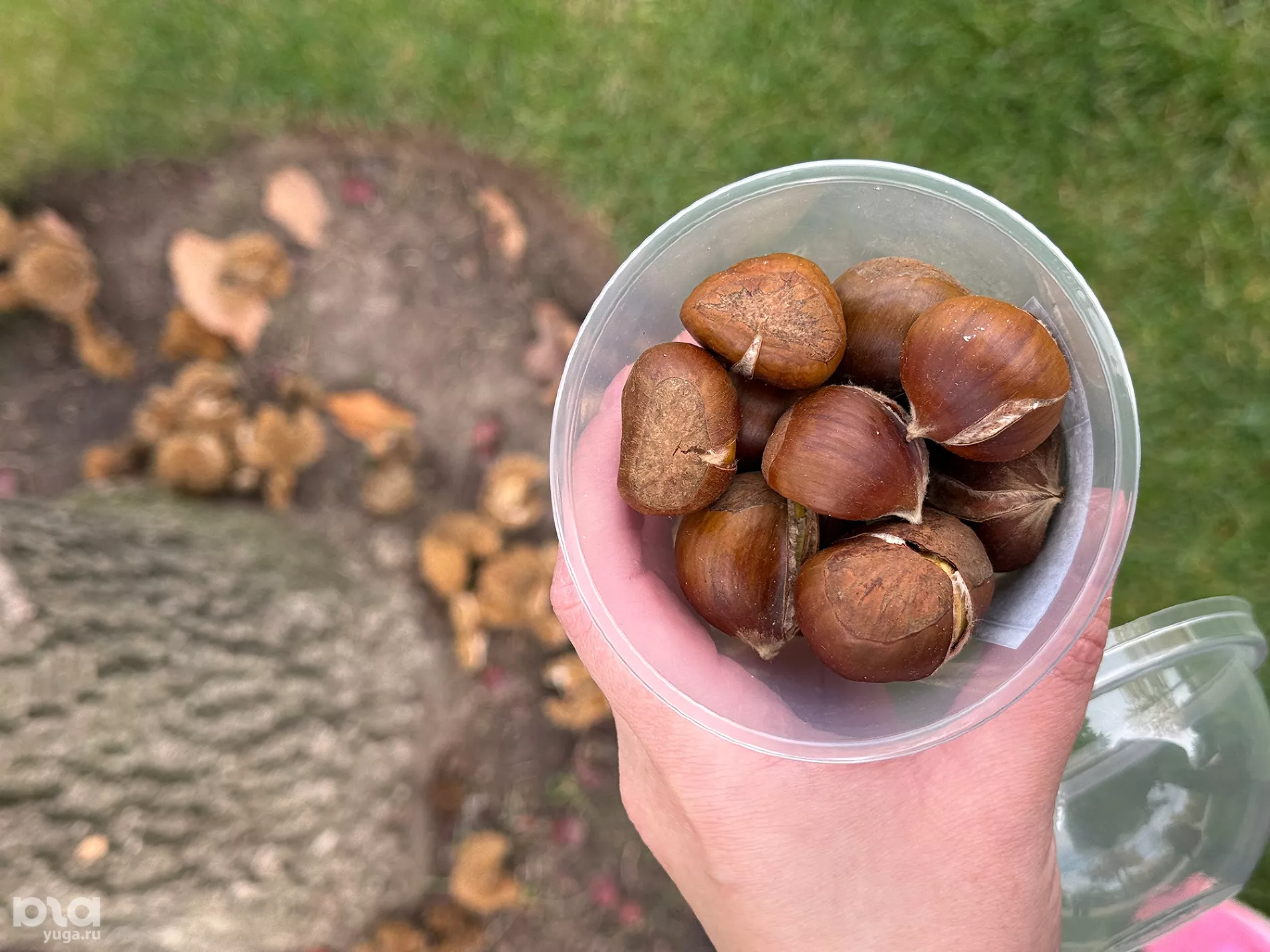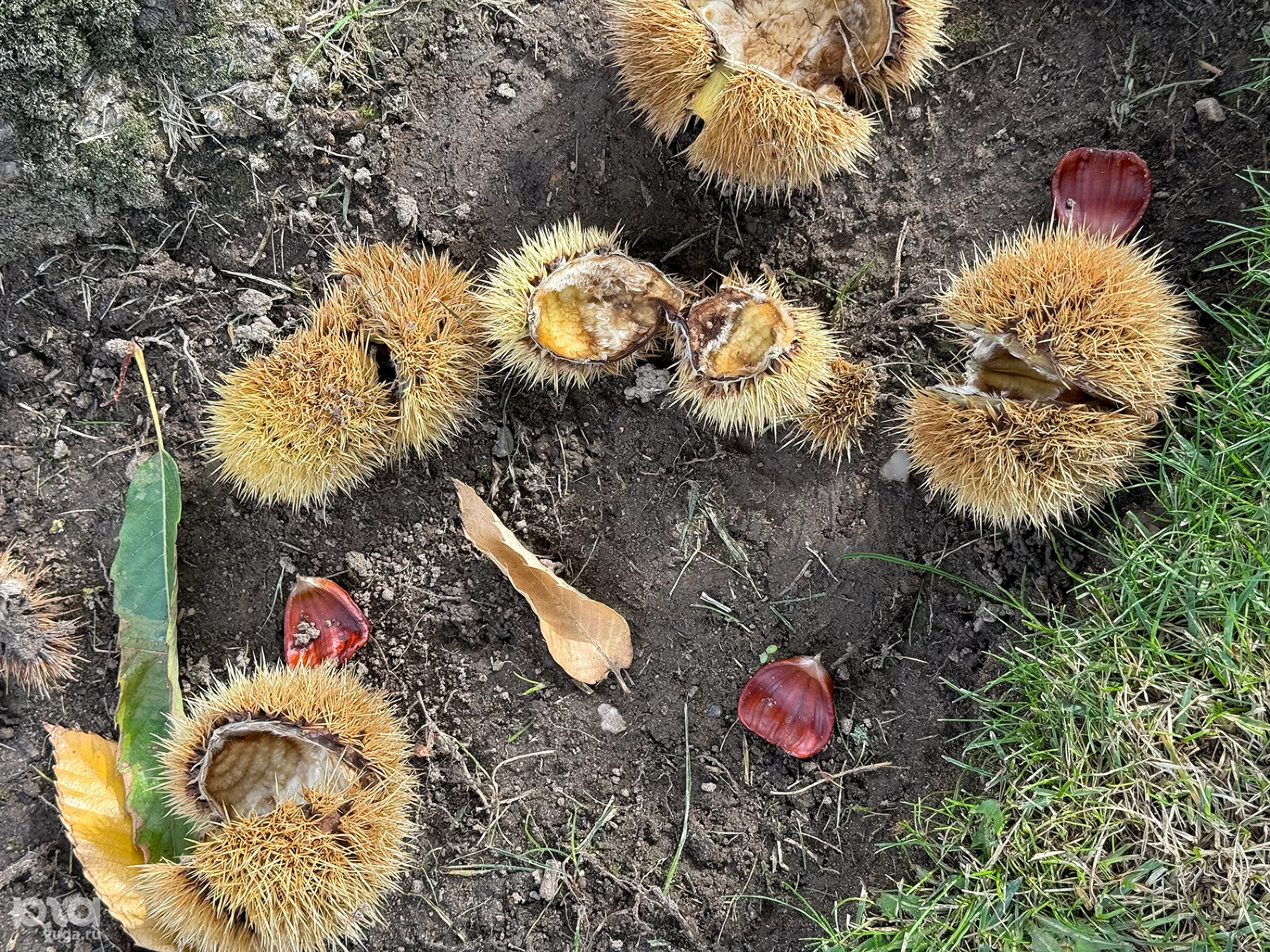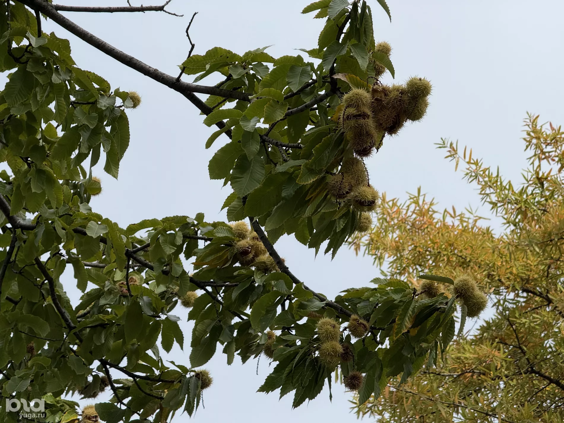 Со съедобным символом осени мы отправились на поиски деревьев, чьи плоды мы только что попробовали. Несколько уже взрослых деревьев каштана посевного (он же съедобный, благородный или настоящий) растут у фонтана «Инфинити». Ветви и земля вокруг усыпаны колючими «ежиками» с орехами внутри. Плоды каштана посевного ценятся в кулинарии, в отличие от несъедобных орехов конского каштана, повсеместно распространенного в Краснодарском крае.