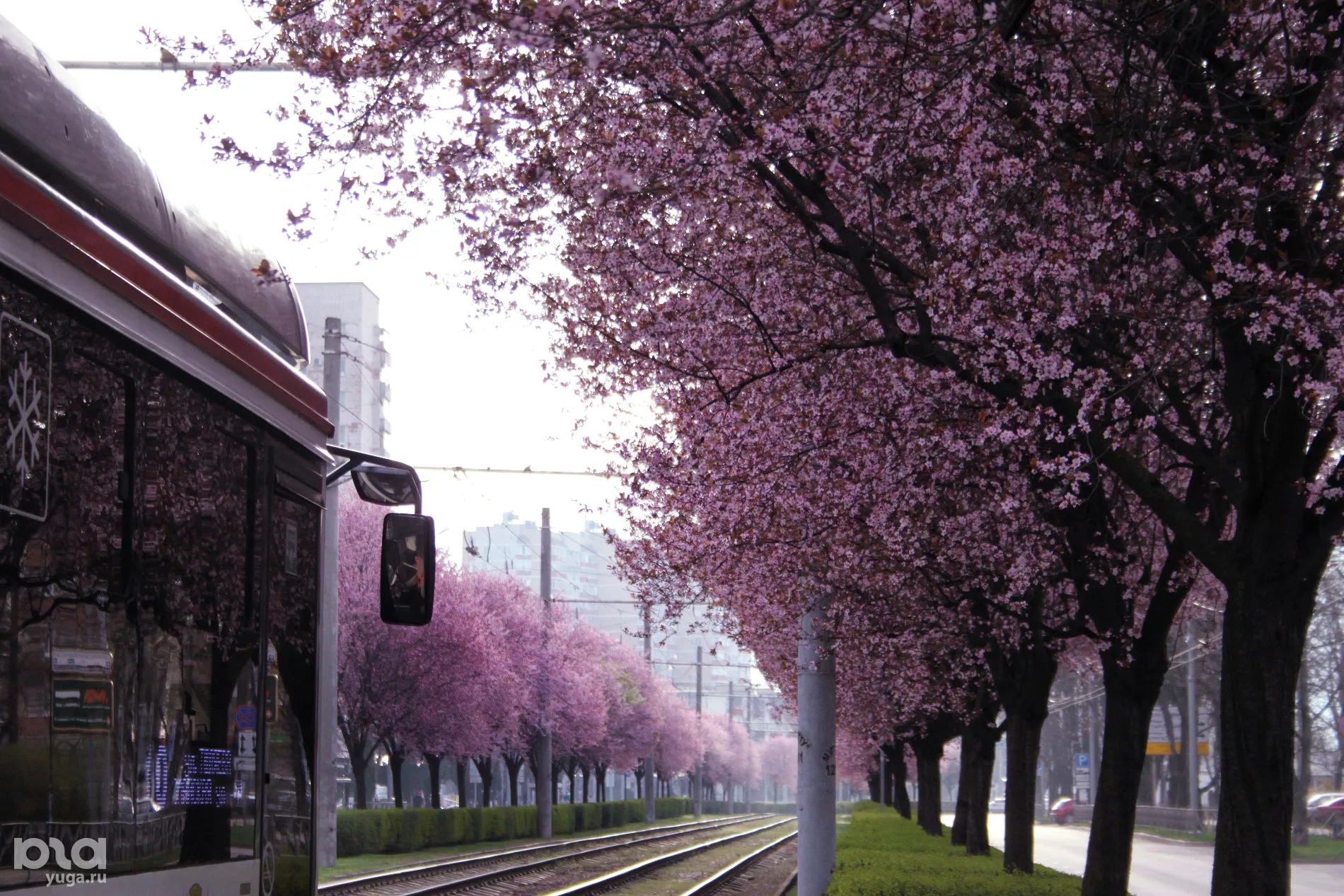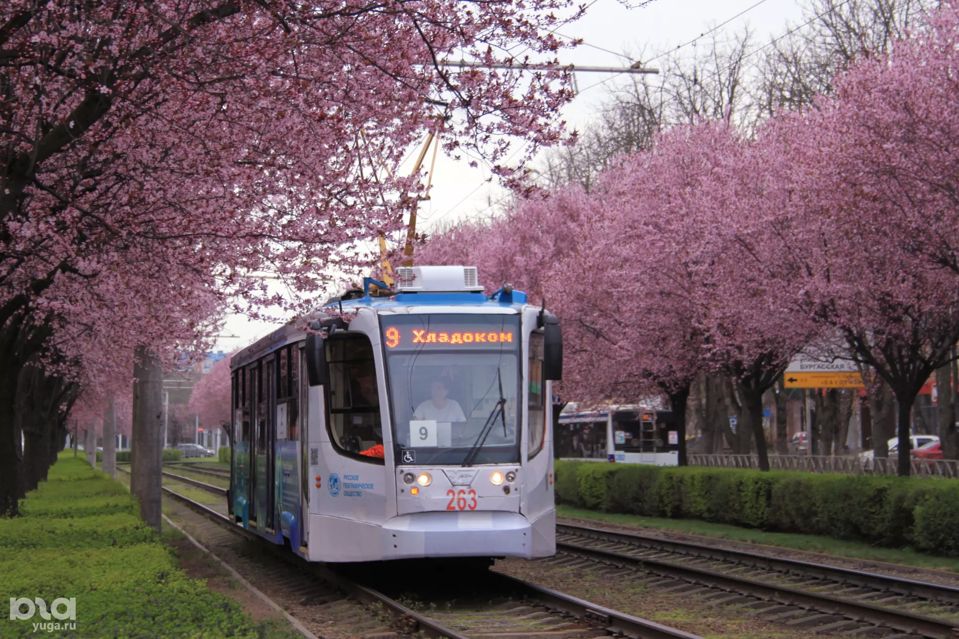 Возвращаемся на самую весеннюю улицу Краснодара, чтобы понаблюдать за цветущими яблонями. Их кроны пышные и раскидистые, а для красивого фона в кадре можно поймать трамвайчики.