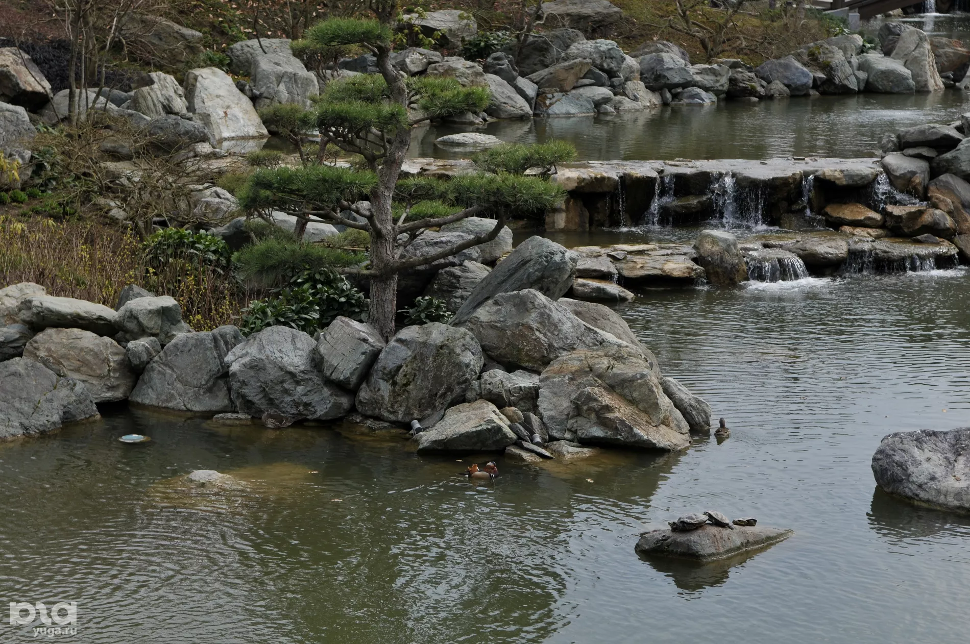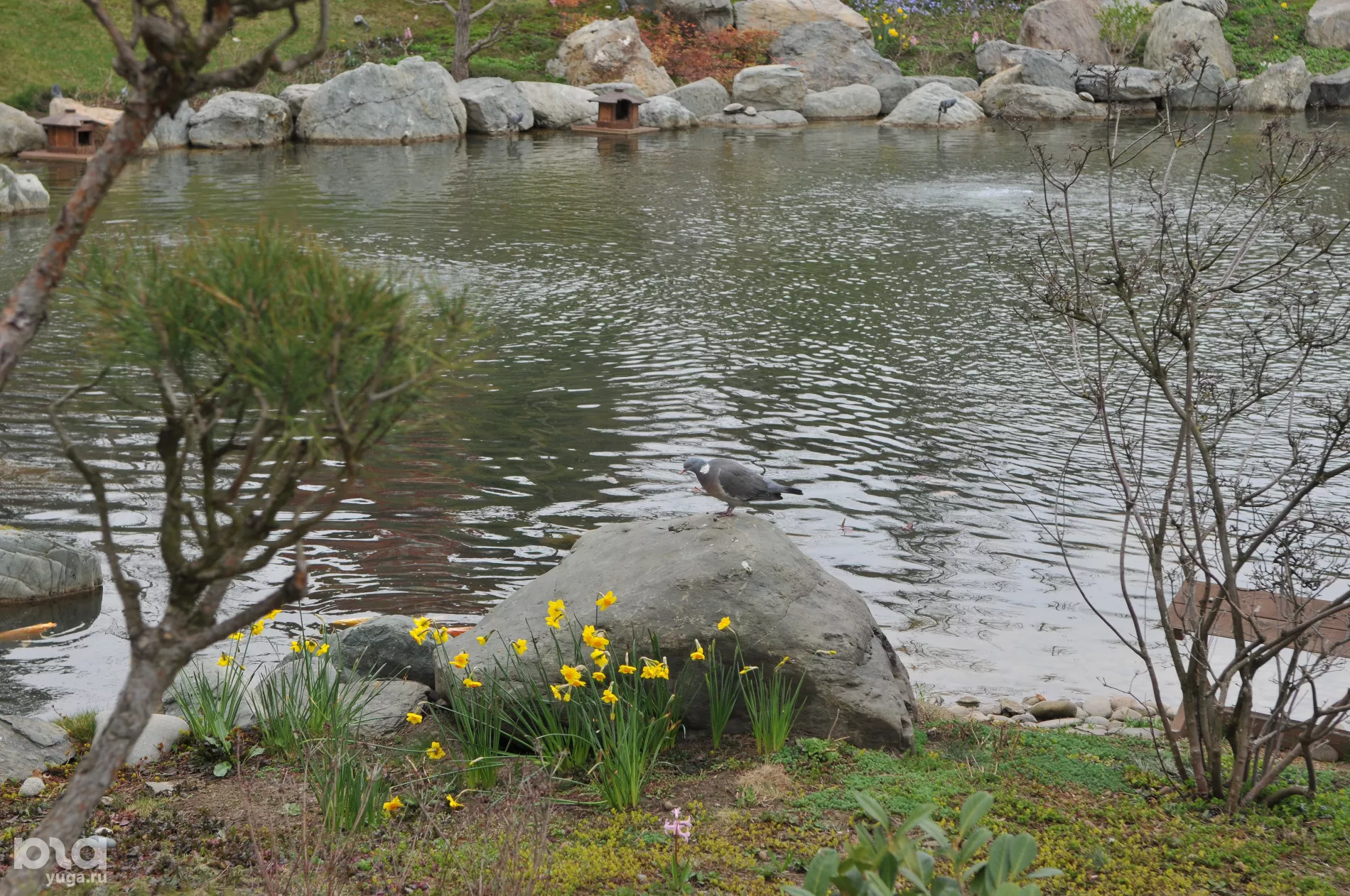 Обитатели сада не дают цветущему пейзажу замереть статичной картинкой. На камнях водоемов нежатся черепахи, а по водной глади грациозно скользят экзотические утки-мандаринки. Эти дикие пернатые остановились здесь на зимовку в октябре прошлого года, но, видимо, перебрались на ПМЖ в столь подходящие им декорации.
